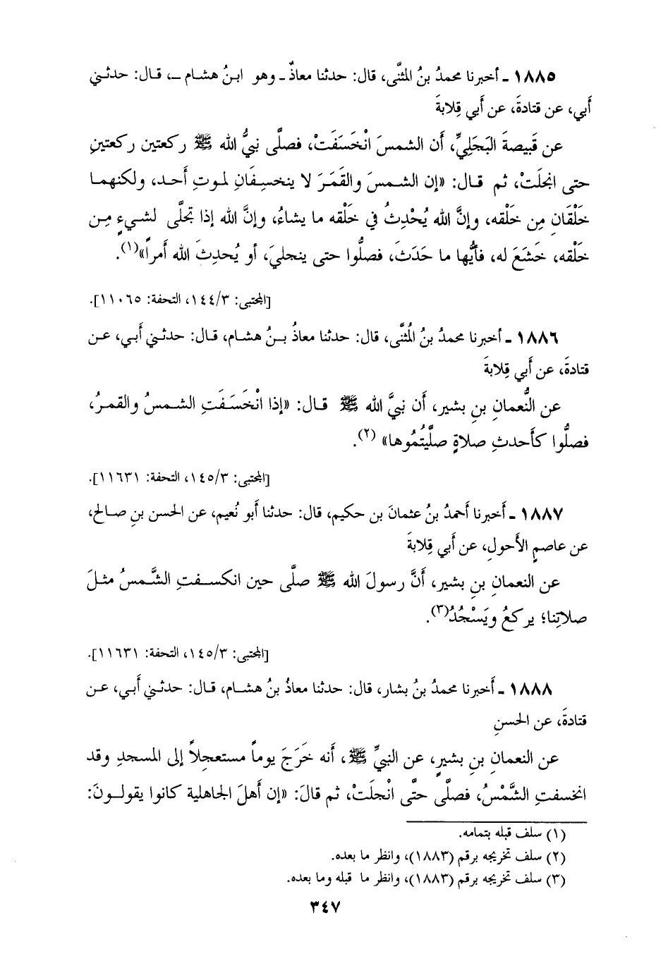 1886 - أَخْبَرَنَا مُحَمَّدُ بْنُ الْمُثَنَّى، قَالَ: حَدَّثَنَا مُعَاذُ بْنُ هِشَامٍ، قَالَ: حَدَّثَنِي أَبِي، عَنْ قَتَادَةَ، عَنْ أَبِي قِلَابَةَ، عَنِ النُّعْمَانِ بْنِ بَشِيرٍ، أَنَّ نَبِيَّ اللهِ صَلَّى اللهُ عَلَيْهِ وَسَلَّمَ قَالَ: «§إِذَا انْخَسَفَتِ الشَّمْسُ، وَالْقَمَرُ فَصَلُّوا كَأَحْدَثِ صَلَاةٍ صَلَّيْتُمُوهَا»