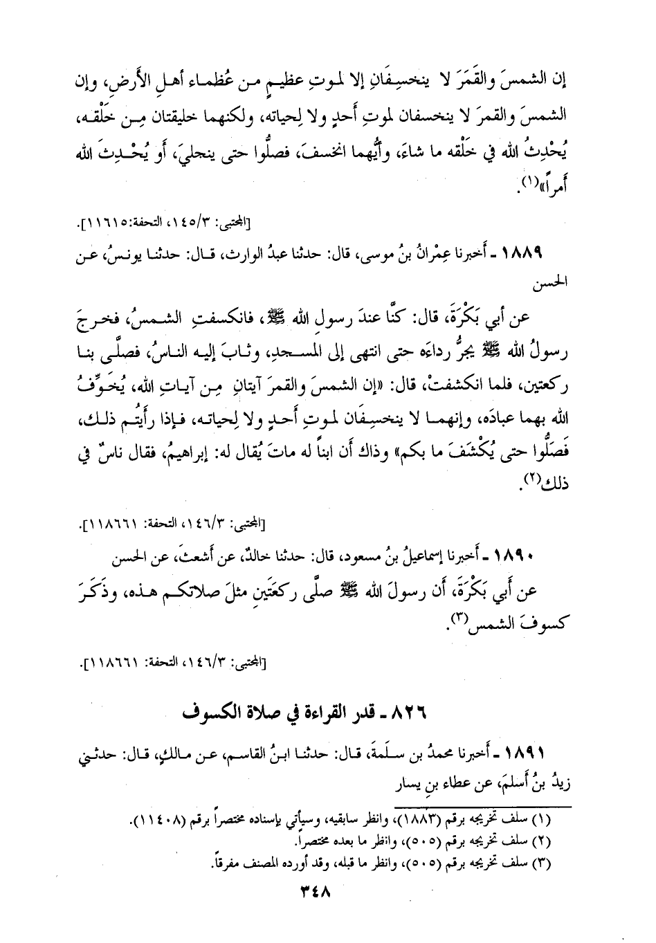 1890 - أَخْبَرَنَا إِسْمَاعِيلُ بْنُ مَسْعُودٍ قَالَ: حَدَّثَنَا خَالِدٌ، عَنْ أَشْعَثَ، عَنِ الْحَسَنِ، عَنْ أَبِي بَكَرَةَ: أَنَّ رَسُولَ اللهِ صَلَّى اللهُ عَلَيْهِ وَسَلَّمَ: «§صَلَّى رَكْعَتَيْنِ مِثْلَ صَلَاتِكُمْ هَذِهِ، وَذَكَرَ كُسُوفَ الشَّمْسِ»