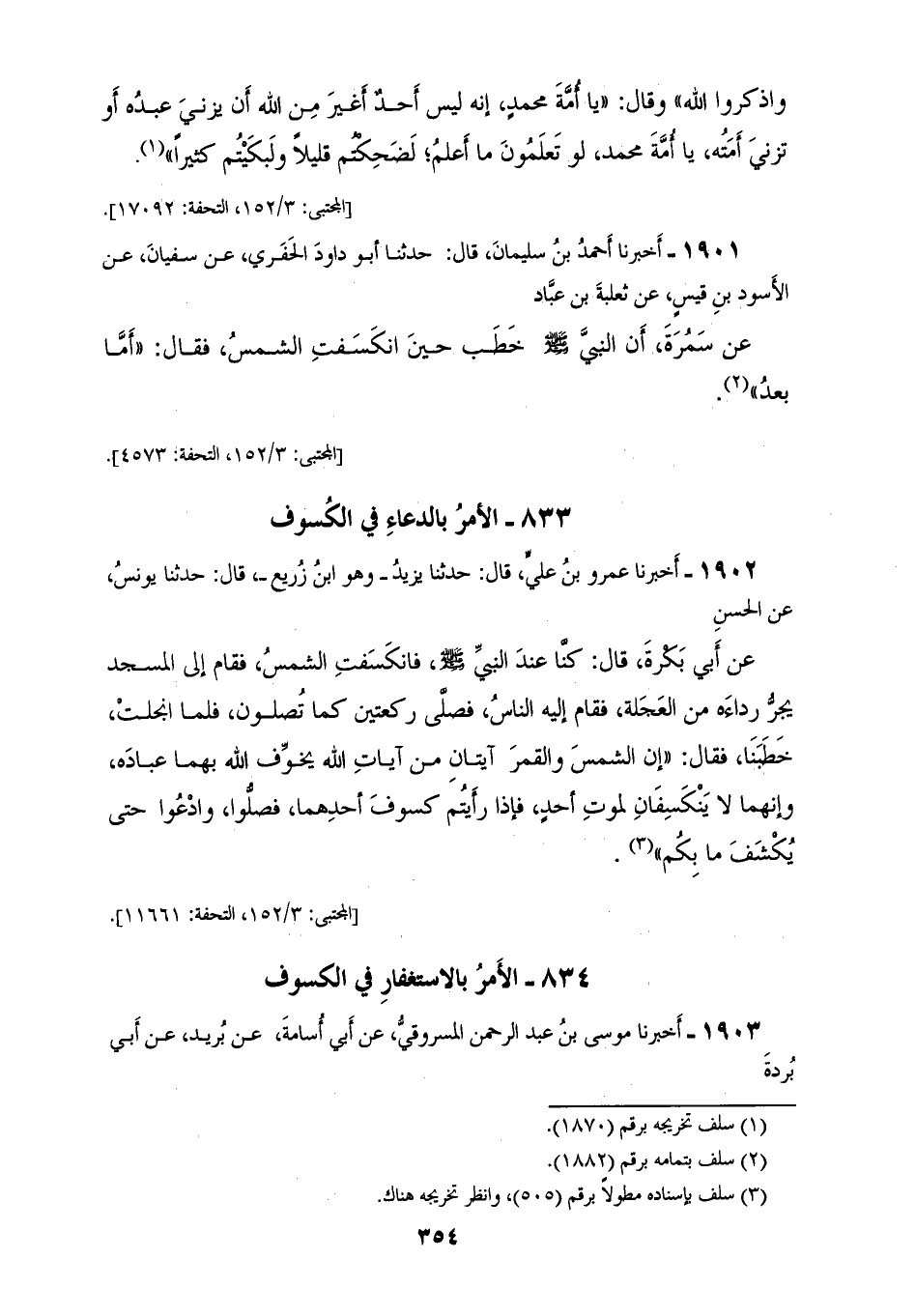 1901 - أَخْبَرَنَا أَحْمَدُ بْنُ سُلَيْمَانَ، قَالَ: حَدَّثَنَا أَبُو دَاوُدَ الْحَفَرِيُّ، عَنْ سُفْيَانَ، عَنِ الْأَسْوَدِ بْنِ قَيْسٍ، عَنْ ثَعْلَبَةَ بْنِ عَبَّادٍ، عَنْ سَمُرَةَ: أَنَّ النَّبِيَّ صَلَّى اللهُ عَلَيْهِ وَسَلَّمَ: §خَطَبَ حِينَ انْكَسَفَتِ الشَّمْسُ، فَقَالَ: «أَمَّا بَعْدُ»