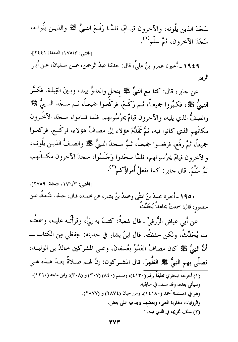 1949 - أَخْبَرَنَا عَمْرُو بْنُ عَلِيٍّ، قَالَ: حَدَّثَنَا عَبْدُ الرَّحْمَنِ، عَنْ سُفْيَانَ، عَنْ أَبِي الزُّبَيْرِ، عَنْ جَابِرٍ، قَالَ: «كُنَّا مَعَ النَّبِيِّ صَلَّى اللهُ عَلَيْهِ وَسَلَّمَ بِنَخْلٍ وَالْعَدُوُّ بَيْنَنَا وَبَيْنَ الْقِبْلَةِ، §فَكَبَّرَ النَّبِيُّ صَلَّى اللهُ عَلَيْهِ وَسَلَّمَ، فَكَبَّرُوا جَمِيعًا، ثُمَّ رَكَعَ فَرَكَعُوا جَمِيعًا، ثُمَّ سَجَدَ النَّبِيُّ صَلَّى اللهُ عَلَيْهِ وَسَلَّمَ، وَالصَّفُّ الَّذِي يَلِيهِ وَالْآخَرُونَ قِيَامٌ يَحْرُسُونَهُمْ فَلَمَّا قَامُوا سَجَدَ الْآخَرُونَ مَكَانَهُمُ الَّذِي كَانُوا فِيهِ، ثُمَّ تَقَدَّمَ هَؤُلَاءِ إِلَى مَصَافِّ هَؤُلَاءِ فَرَكَعَ فَرَكَعُوا جَمِيعًا، ثُمَّ رَفَعَ فَرَفَعُوا جَمِيعًا، ثُمَّ سَجَدَ النَّبِيُّ صَلَّى اللهُ عَلَيْهِ وَسَلَّمَ، وَالصَّفُّ الَّذِينَ يَلُونَهُ وَالْآخَرُونَ قِيَامٌ يَحْرُسُونَهُمْ فَلَمَّا سَجَدُوا، وَجَلَسُوا سَجَدَ الْآخَرُونَ مَكَانَهُمْ، ثُمَّ سَلَّمَ». قَالَ جَابِرٌ: كَمَا يَفْعَلُ أُمَرَاؤُكُمْ