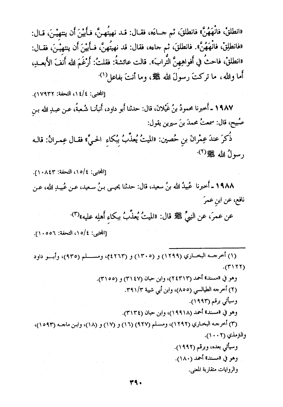 1986 - أَخْبَرَنَا يُونُسُ بْنُ عَبْدِ الْأَعْلَى، قَالَ: حَدَّثَنَا عَبْدُ اللهِ بْنُ وَهْبٍ، قَالَ: قَالَ مُعَاوِيَةُ بْنُ صَالِحٍ: وَحَدَّثَنِي يَحْيَى بْنُ سَعِيدٍ، عَنْ عَمْرَةَ، عَنْ عَائِشَةَ، قَالَتْ: لَمَّا أَتَى نَعْيُ زَيْدِ بْنِ حَارِثَةَ، وَجَعْفَرِ بْنِ أَبِي طَالِبٍ، وَعَبْدِ اللهِ بْنِ رَوَاحَةَ جَلَسَ رَسُولُ اللهِ صَلَّى اللهُ عَلَيْهِ وَسَلَّمَ: يُعْرَفُ فِي وَجْهِهِ الْحُزْنُ، وَأَنَا أَنْظُرُ مِنْ صِيرِ الْبَابِ فَجَاءَهُ رَجُلٌ فَقَالَ: إِنَّ نِسَاءَ جَعْفَرٍ يَبْكِينَ فَقَالَ لَهُ رَسُولُ اللهِ صَلَّى اللهُ عَلَيْهِ وَسَلَّمَ: «§انْطَلِقْ فَانْهَهُنَّ»، فَانْطَلَقَ ثُمَّ جَاءَهُ فَقَالَ: قَدْ نَهَيْتُهُنَّ فَأَبَيْنَ أَنْ يَنْتَهِينَ قَالَ: «فَانْطَلِقْ فَانْهَهُنَّ» فَانْطَلَقَ ثُمَّ جَاءَهُ فَقَالَ: قَدْ نَهَيْتُهُنَّ فَأَبَيْنَ أَنْ يَنْتَهِينَ فَقَالَ: «انْطَلِقْ فَاحْثُ فِي أَفْوَاهِهِنَّ التُّرَابَ»، قَالَتْ عَائِشَةُ فَقُلْتُ: أَرْغَمَ اللهُ أَنْفَ الْأَبْعَدِ أَمَا، وَاللهِ مَا تَرَكْتَ رَسُولَ اللهِ صَلَّى اللهُ عَلَيْهِ وَسَلَّمَ، وَمَا أَنْتَ بِفَاعِلٍ