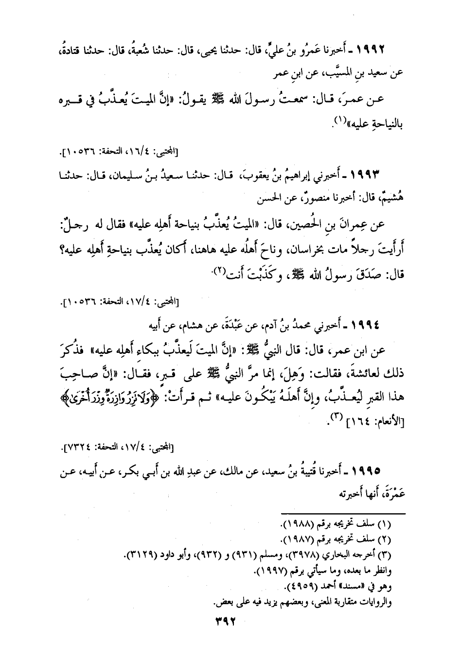 1994 - أَخْبَرَنِي مُحَمَّدُ بْنُ آدَمَ، عَنْ عَبْدَةَ، عَنْ هِشَامٍ، عَنْ أَبِيهِ، عَنِ ابْنِ عُمَرَ، قَالَ: قَالَ النَّبِيُّ صَلَّى اللهُ عَلَيْهِ وَسَلَّمَ: " إِنَّ §الْمَيِّتَ لَيُعَذَّبُ بِبُكَاءِ أَهْلِهِ عَلَيْهِ فَذُكِرَ ذَلِكَ لِعَائِشَةَ فَقَالَتْ: وَهَلْ إِنَّمَا مَرَّ النَّبِيُّ صَلَّى اللهُ عَلَيْهِ وَسَلَّمَ، عَلَى قَبْرٍ فَقَالَ: " إِنَّ صَاحِبَ هَذَا الْقَبْرِ لَيُعَذَّبُ، وَإِنَّ أَهْلَهُ يَبْكُونَ عَلَيْهِ، ثُمَّ قَرَأَتْ {وَلَا تَزِرُ وَازِرَةٌ وِزْرَ أُخْرَى} [الأنعام: 164]