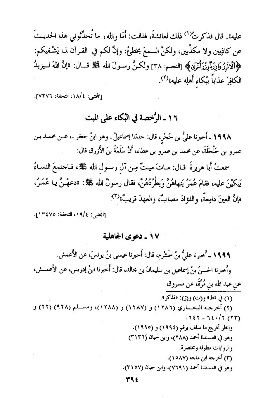 1999 - أَخْبَرَنَا عَلِيُّ بْنُ خَشْرَمٍ، قَالَ: أَخْبَرَنَا عِيسَى بْنُ يُونُسَ، عَنِ الْأَعْمَشِ، وَأَخْبَرَنَا الْحَسَنُ بْنُ إِسْمَاعِيلَ بْنِ سُلَيْمَانَ بْنِ مُجَالِدٍ، قَالَ: أَخْبَرَنَا ابْنُ إِدْرِيسَ، عَنِ الْأَعْمَشِ، عَنْ عَبْدِ اللهِ بْنِ مُرَّةَ، عَنْ مَسْرُوقٍ، عَنْ عَبْدِ اللهِ، قَالَ: قَالَ رَسُولُ اللهِ صَلَّى اللهُ عَلَيْهِ وَسَلَّمَ: «§لَيْسَ مِنَّا مَنْ ضَرَبَ الْخُدُودَ، وَشَقَّ الْجُيُوبَ، وَدَعَا بِدُعَاءِ الْجَاهِلِيَّةِ»، وَقَالَ حَسَنٌ: بِدَعْوَى