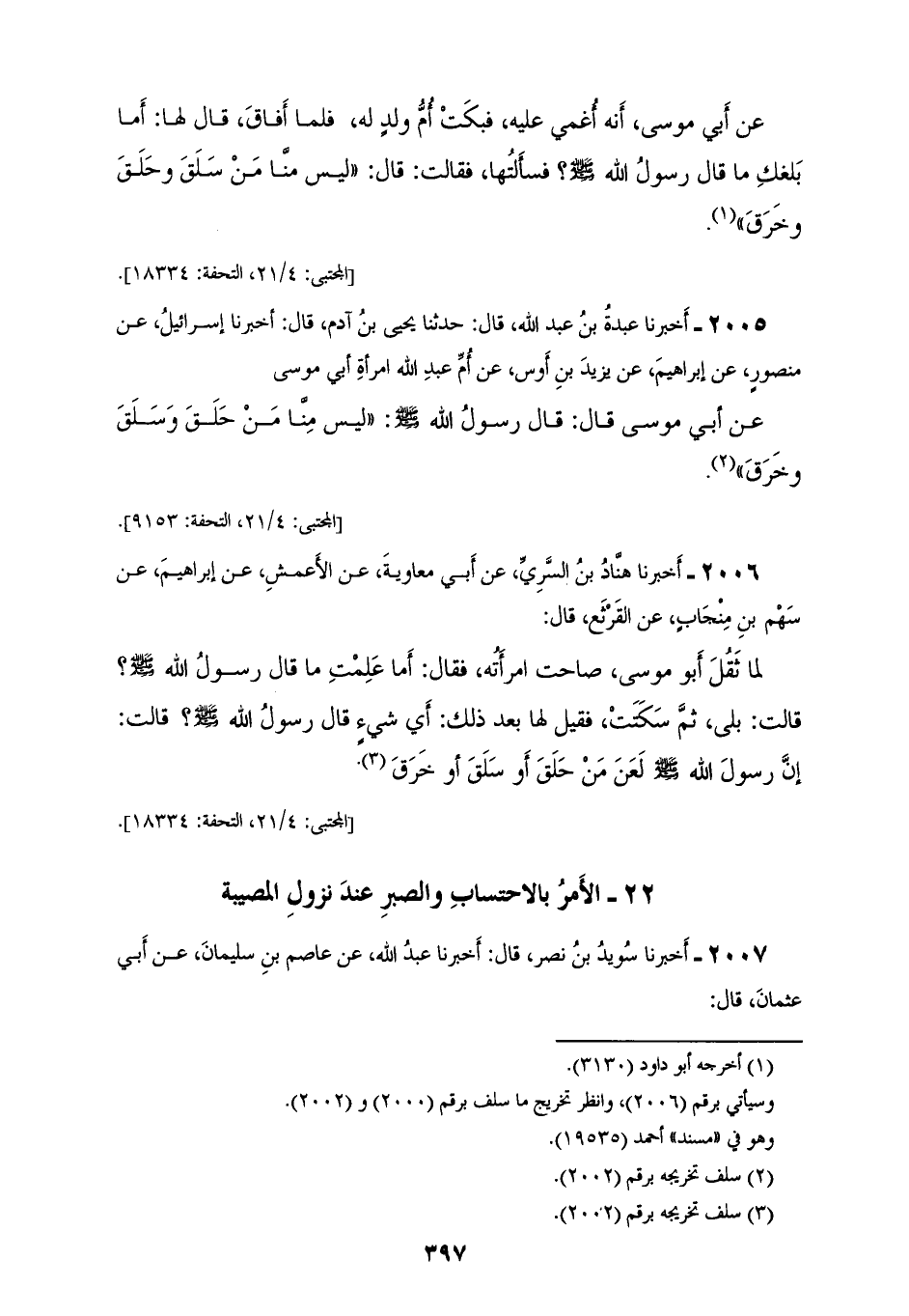 2005 - أَخْبَرَنَا عَبْدَةُ بْنُ عَبْدِ اللهِ، قَالَ: حَدَّثَنَا يَحْيَى بْنُ آدَمَ، قَالَ: أَخْبَرَنَا إِسْرَائِيلُ، عَنْ مَنْصُورٍ، عَنِ إِبْرَاهِيمَ، عَنْ يَزِيدَ بْنِ أَوْسٍ، عَنْ أُمِّ عَبْدِ اللهِ، امْرَأَةِ أَبِي مُوسَى، عَنْ أَبِي مُوسَى، قَالَ: قَالَ رَسُولُ اللهِ صَلَّى اللهُ عَلَيْهِ وَسَلَّمَ: «§لَيْسَ مِنَّا مَنْ حَلَقَ، وَسَلَقَ، وَخَرَقَ»