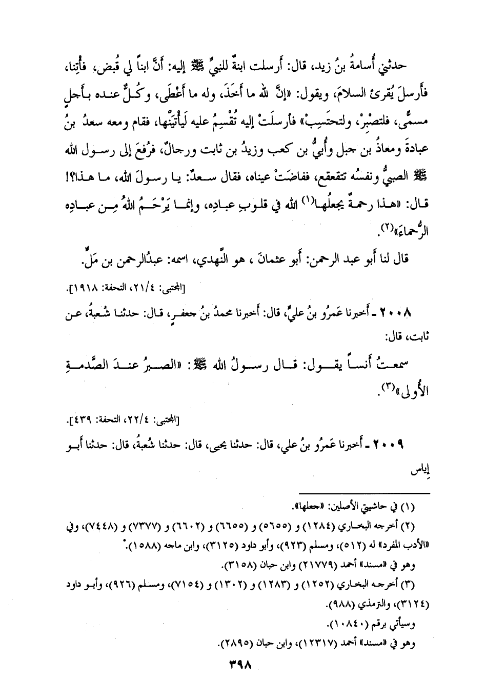 2007 - أَخْبَرَنَا سُوَيْدُ بْنُ نَصْرٍ، قَالَ: أَخْبَرَنَا عَبْدُ اللهِ، عَنْ عَاصِمِ بْنِ سُلَيْمَانَ، عَنْ أَبِي عُثْمَانَ، قَالَ: حَدَّثَنِي أُسَامَةُ بْنُ زَيْدٍ، قَالَ: أَرْسَلَتِ ابْنَةٌ لِلنَّبِيِّ صَلَّى اللهُ عَلَيْهِ وَسَلَّمَ إِلَيْهِ أَنَّ ابْنًا لِي قُبِضَ فَأْتِنَا فَأَرْسَلَ يُقْرِئُ السَّلَامَ وَيَقُولُ: «إِنَّ لِلَّهِ مَا أَخَذَ، وَلَهُ مَا أَعْطَى، وَكُلٌّ عِنْدَهُ بِأَجَلٍ مُسَمًّى فَلْتَصْبِرْ، وَلْتَحْتَسِبْ»، فَأَرْسَلَتْ إِلَيْهِ تُقْسِمُ عَلَيْهِ لَيَأْتِيَنَّهَا فَقَامَ وَمَعَهُ سَعْدُ بْنُ عُبَادَةَ، وَمُعَاذُ بْنُ جَبَلٍ، وَأُبَيُّ بْنُ كَعْبٍ، وَزَيْدُ بْنُ ثَابِتٍ، وَرِجَالٌ فَرُفِعَ إِلَى رَسُولِ اللهِ صَلَّى اللهُ عَلَيْهِ وَسَلَّمَ الصَّبِيُّ وَنَفْسُهُ تَتَقَعْقَعُ فَفَاضَتْ عَيْنَاهُ فَقَالَ سَعْدٌ: يَا رَسُولَ اللهِ، مَا هَذَا؟، قَالَ: «§هَذَا رَحْمَةٌ يَجْعَلُهَا اللهُ فِي قُلُوبِ عِبَادِهِ، وَإِنَّمَا يَرْحَمُ اللهُ مِنْ عِبَادِهِ الرُّحَمَاءَ»، قَالَ: لَنَا أَبُو عَبْدِ الرَّحْمَنِ: أَبُو عُثْمَانَ هُوَ النَّهْدِيُّ اسْمُهُ عَبْدُ الرَّحْمَنِ بْنُ مَلٍّ