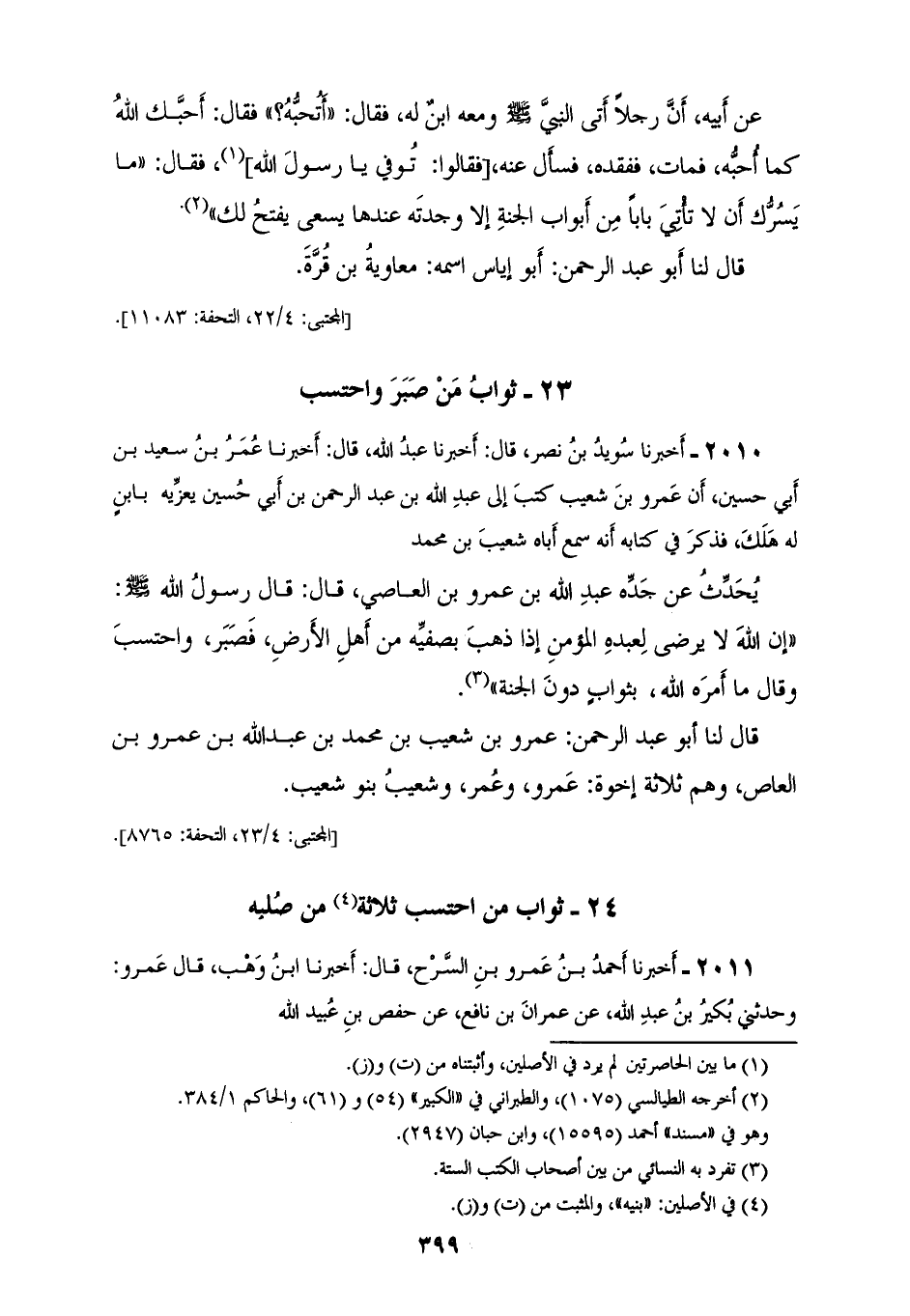 2010 - أَخْبَرَنَا سُوَيْدُ بْنُ نَصْرٍ قَالَ: أَخْبَرَنَا عَبْدُ اللهِ قَالَ: أَخْبَرَنَا عُمَرُ بْنُ سَعِيدِ بْنِ أَبِي حُسَيْنٍ، أَنَّ عَمْرَو بْنَ شُعَيْبٍ، كَتَبَ إِلَى عَبْدِ اللهِ بْنِ عَبْدِ الرَّحْمَنِ بْنِ أَبِي حُسَيْنٍ يُعَزِّيهِ بِابْنٍ لَهُ هَلَكَ فَذَكَرَ فِي كِتَابِهِ أَنَّهُ سَمِعَ أَبَاهُ شُعَيْبَ بْنَ مُحَمَّدٍ يُحَدِّثُ عَنْ جَدِّهِ عَبْدِ اللهِ بْنِ عَمْرِو بْنِ الْعَاصِي قَالَ: قَالَ رَسُولُ اللهِ صَلَّى اللهُ عَلَيْهِ وَسَلَّمَ " إِنَّ §اللهَ لَا يَرْضَى لِعَبْدِهِ الْمُؤْمِنِ إِذَا ذَهَبَ بِصَفِيِّهِ مِنْ أَهْلِ الْأَرْضِ فَصَبَرَ وَاحْتَسَبَ وَقَالَ: مَا أَمَرَهُ اللهُ بِثَوَابٍ دُونَ الْجَنَّةِ " قَالَ لَنَا أَبُو عَبْدِ الرَّحْمَنِ: عَمْرُو بْنُ شُعَيْبِ بْنِ مُحَمَّدِ بْنِ عَبْدِ اللهِ بْنِ عَمْرِو بْنِ الْعَاصِ وَهُمْ ثَلَاثَةُ إِخْوَةٍ: عَمْرٌو وَعُمَرُ وَشُعَيْبُ بَنُو شُعَيْبَ