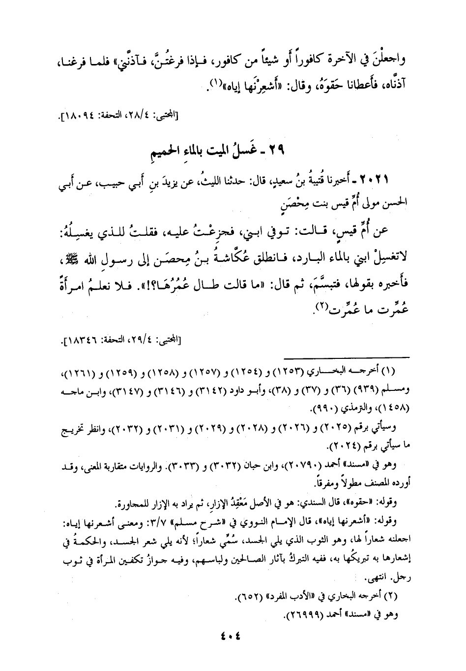 2021 - أَخْبَرَنَا قُتَيْبَةُ بْنُ سَعِيدٍ قَالَ: حَدَّثَنَا اللَّيْثُ، عَنْ يَزِيدَ بْنِ أَبِي حَبِيبٍ، عَنْ أَبِي الْحَسَنِ، مَوْلَى أُمِّ قَيْسٍ بِنْتِ مِحْصَنٍ، عَنْ أُمِّ قَيْسٍ قَالَتْ: تُوُفِّيَ ابْنِي فَجَزِعْتُ عَلَيْهِ فَقُلْتُ لِلَّذِي يُغَسِّلُهُ: لَا تُغَسِّلِ ابْنِي بِالْمَاءِ الْبَارِدِ فَانْطَلَقَ عُكَّاشَةُ بْنُ مِحْصَنٍ إِلَى رَسُولِ اللهِ صَلَّى اللهُ عَلَيْهِ وَسَلَّمَ فَأَخْبَرَهُ بِقَوْلِهَا فَتَبَسَّمَ ثُمَّ قَالَ: «§مَا قَالَتْ طَالَ عُمْرُهَا فَلَا نَعَلَمُ امْرَأَةً عَمَّرَتْ مَا عَمَّرَتْ»