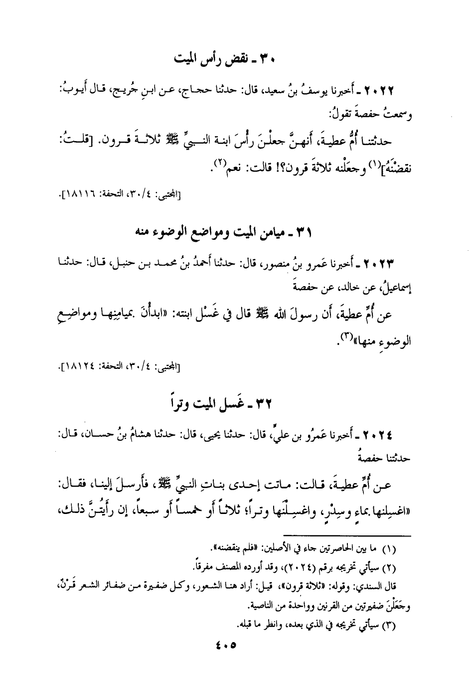 2023 - أَخْبَرَنَا عَمْرُو بْنُ مَنْصُورٍ قَالَ: حَدَّثَنَا أَحْمَدُ بْنُ مُحَمَّدِ بْنِ حَنْبَلٍ قَالَ: حَدَّثَنَا إِسْمَاعِيلُ، عَنْ خَالِدٍ، عَنْ حَفْصَةَ، عَنْ أُمِّ عَطِيَّةَ أَنَّ رَسُولَ اللهِ صَلَّى اللهُ عَلَيْهِ وَسَلَّمَ قَالَ فِي غُسْلِ ابْنَتِهِ «§ابْدَأْنَ بِمَيَامِنِهَا وَمَوَاضِعِ الْوضُوءِ مِنْهَا»