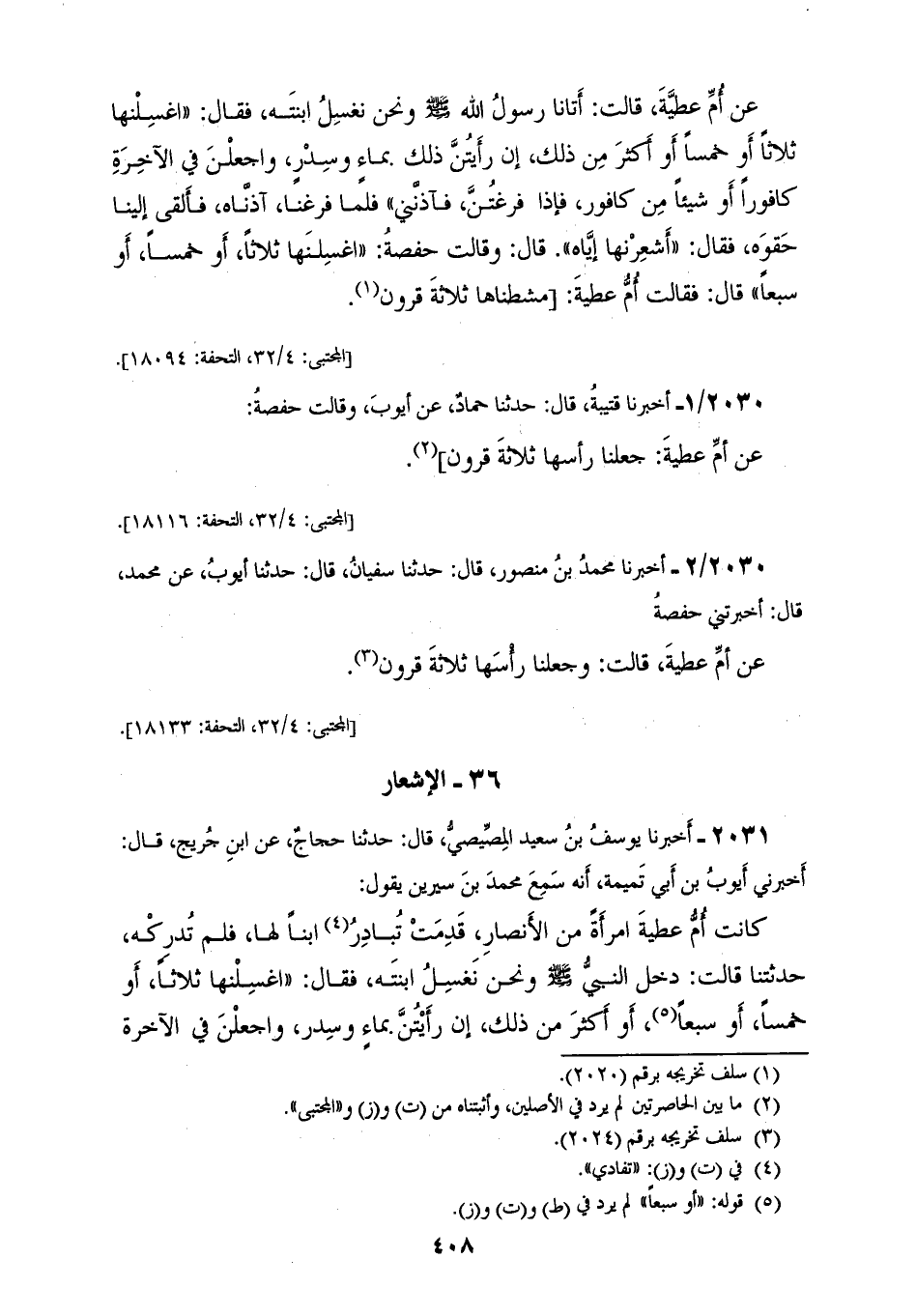 2031 - أَخْبَرَنَا يُوسُفُ بْنُ سَعِيدٍ الْمِصِّيصِيُّ قَالَ: حَدَّثَنَا حَجَّاجٌ، عَنِ ابْنِ جُرَيْجٍ قَالَ: أَخْبَرَنِي أَيُّوبُ بْنُ أَبِي تَمِيمَةَ، أَنَّهُ سَمِعَ مُحَمَّدَ بْنَ سِيرِينَ يَقُولُ: كَانَتْ أُمُّ عَطِيَّةَ امْرَأَةً مِنَ الْأَنْصَارِ قَدِمَتْ تُفَادَى ابْنًا لَهَا فَلَمْ تُدْرِكْهُ حَدَّثَتْنَا قَالَتْ: دَخَلَ النَّبِيُّ صَلَّى اللهُ عَلَيْهِ وَسَلَّمَ وَنَحْنُ نُغَسِّلُ ابْنَتَهُ فَقَالَ: «§اغْسِلْنَهَا ثَلَاثًا أَوْ خَمْسًا أَوْ أَكْثَرَ مِنْ ذَلِكَ إِنْ رَأَيْتُنَّ بِمَاءٍ وَسِدْرٍ وَاجْعَلْنَ فِي الْآخِرَةِ كَافُورًا أَوْ شَيْئًا مِنْ كَافُورٍ فَإِذَا فَرَغْتُنَّ فَآذِنَّنِي» فَلَمَّا فَرَغْنَا أَلْقَى إِلَيْنَا حِقْوَهُ فَقَالَ: «أَشْعِرْنَهَا إِيَّاهُ» وَلَمْ يَزِدْ عَلَى ذَلِكَ قَالَ: لَا أَدْرِي أَيَّ بَنَاتِهِ قُلْتُ: مَا قَوْلُهُ أَشْعِرْنَهَا أَتُؤَزَّرُ؟ قَالَ: لَا إِلَّا أَنْ يَقُولَ: الْفُفْنَهَا فِيهِ