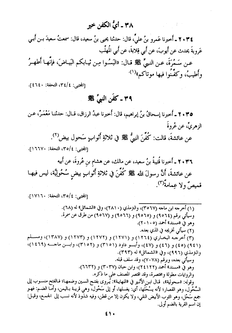 2035 - أَخْبَرَنَا إِسْحَاقُ بْنُ إِبْرَاهِيمَ قَالَ: أَخْبَرَنَا عَبْدُ الرَّزَّاقِ قَالَ: حَدَّثَنَا مَعْمَرٌ، عَنِ الزُّهْرِيِّ، عَنْ عُرْوَةَ، عَنْ عَائِشَةَ قَالَتْ: «§كُفِّنَ النَّبِيُّ صَلَّى اللهُ عَلَيْهِ وَسَلَّمَ فِي ثَلَاثَةِ أَثْوَابٍ سُحُولٍ بِيضٍ»