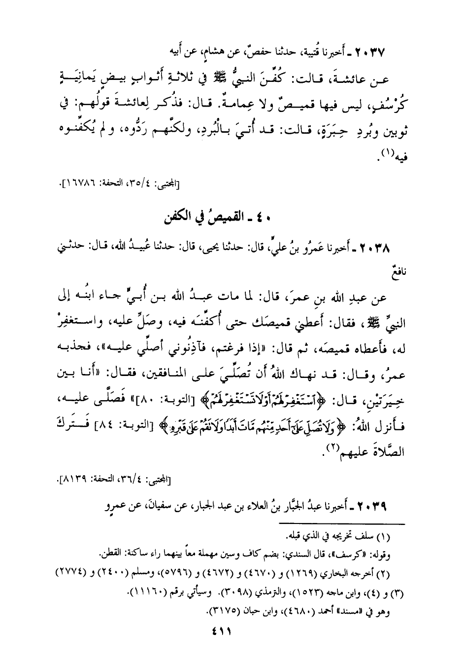 2037 - أَخْبَرَنَا قُتَيْبَةُ حَدَّثَنَا حَفْصٌ، عَنْ هِشَامٍ، عَنْ أَبِيهِ، عَنْ عَائِشَةَ قَالَتْ: «§كُفِّنَ النَّبِيُّ صَلَّى اللهُ عَلَيْهِ وَسَلَّمَ فِي ثَلَاثَةِ أَثْوَابٍ بِيضٍ يَمَانِيَةٍ كُرْسُفٍ لَيْسَ فِيهَا قَمِيصٌ وَلَا عِمَامَةٌ» قَالَ: فَذُكِرَ لِعَائِشَةَ قَوْلُهُمْ فِي ثَوْبَيْنِ وَبُرْدٍ حِبَرَةٍ قَالَتْ: قَدْ أُتِيَ بِالْبُرْدِ وَلَكِنَّهُمْ رَدُّوهُ وَلَمْ يُكَفِّنُوهُ فِيهِ