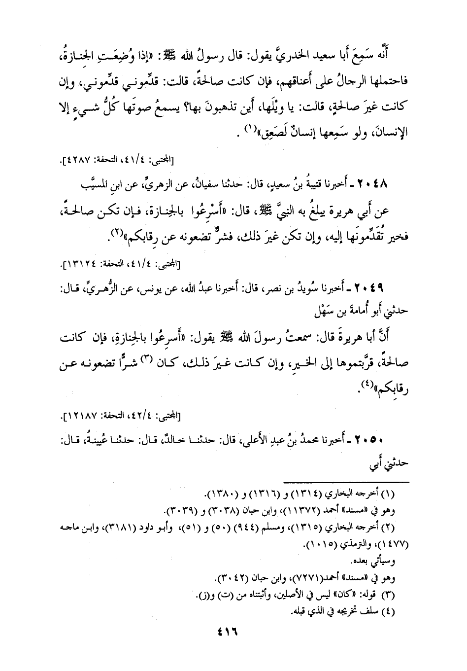 2048 - أَخْبَرَنَا قُتَيْبَةُ بْنُ سَعِيدٍ قَالَ: حَدَّثَنَا سُفْيَانُ، عَنِ الزُّهْرِيِّ، عَنِ ابْنِ الْمُسَيَّبِ، عَنْ أَبِي هُرَيْرَةَ، يَبْلُغُ بِهِ النَّبِيَّ صَلَّى اللهُ عَلَيْهِ وَسَلَّمَ قَالَ: «§أَسْرِعُوا بِالْجِنَازَةِ فَإِنْ تَكُنْ صَالِحَةً فَخَيْرٌ تُقَدِّمُونَهَا إِلَيْهِ وَإِنْ تَكُنْ غَيْرَ ذَلِكَ فَشَرٌّ تَضَعُونَهُ عَنْ رِقَابِكُمْ»