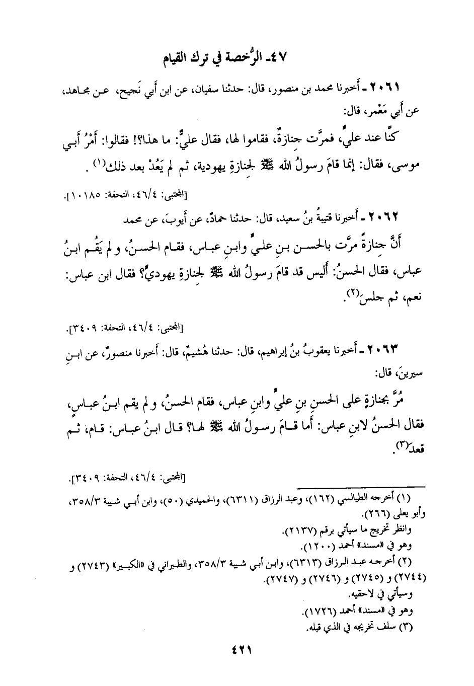 2061 - أَخْبَرَنَا مُحَمَّدُ بْنُ مَنْصُورٍ، قَالَ: حَدَّثَنَا سُفْيَانُ، عَنِ ابْنِ أَبِي نَجِيحٍ، عَنْ مُجَاهِدٍ، عَنْ أَبِي مَعْمَرٍ قَالَ: كُنَّا عِنْدَ عَلِيٍّ فَمَرَّتْ جِنَازَةٌ فَقَامُوا لَهَا فَقَالَ عَلِيٌّ: مَا هَذا؟ فَقَالُوا: أَمْرُ أَبِي مُوسَى فَقَالَ: «إِنَّمَا §قَامَ رَسُولُ اللهِ صَلَّى اللهُ عَلَيْهِ وَسَلَّمَ لِجِنَازَةِ يَهُودِيَّةٍ، ثُمَّ لَمْ يَعُدْ بَعْدَ ذَلِكَ»
