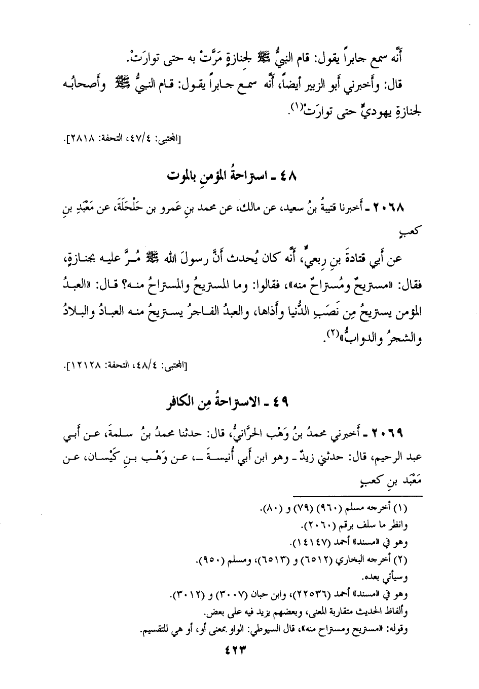 2068 - أَخْبَرَنَا قُتَيْبَةُ بْنُ سَعِيدٍ، عَنْ مَالِكٍ، عَنْ مُحَمَّدِ بْنِ عَمْرِو بْنِ حَلْحَلَةَ، عَنْ مَعْبَدِ بْنِ كَعْبٍ، عَنْ أَبِي قَتَادَةَ بْنِ رِبْعِيٍّ، أَنَّهُ كَانَ يُحَدِّثُ أَنَّ رَسُولَ اللهِ صَلَّى اللهُ عَلَيْهِ وَسَلَّمَ مُرَّ عَلَيْهِ بِجِنَازَةٍ فَقَالَ: «مُسْتَرِيحٌ وَمُسْتَرَاحٌ مِنْهُ» فَقَالُوا: وَمَا الْمُسْتَرِيحُ وَالْمُسْتَرَاحُ مِنْهُ؟ قَالَ: «§الْعَبْدُ الْمُؤْمِنُ يَسْتَرِيحُ مِنْ نَصَبِ الدُّنْيَا، وَأَذَاهَا وَالْعَبْدُ الْفَاجِرُ يَسْتَرِيحُ مِنْهُ الْعِبَادُ وَالْبِلَادُ وَالشَّجَرُ وَالدَّوَابُّ»