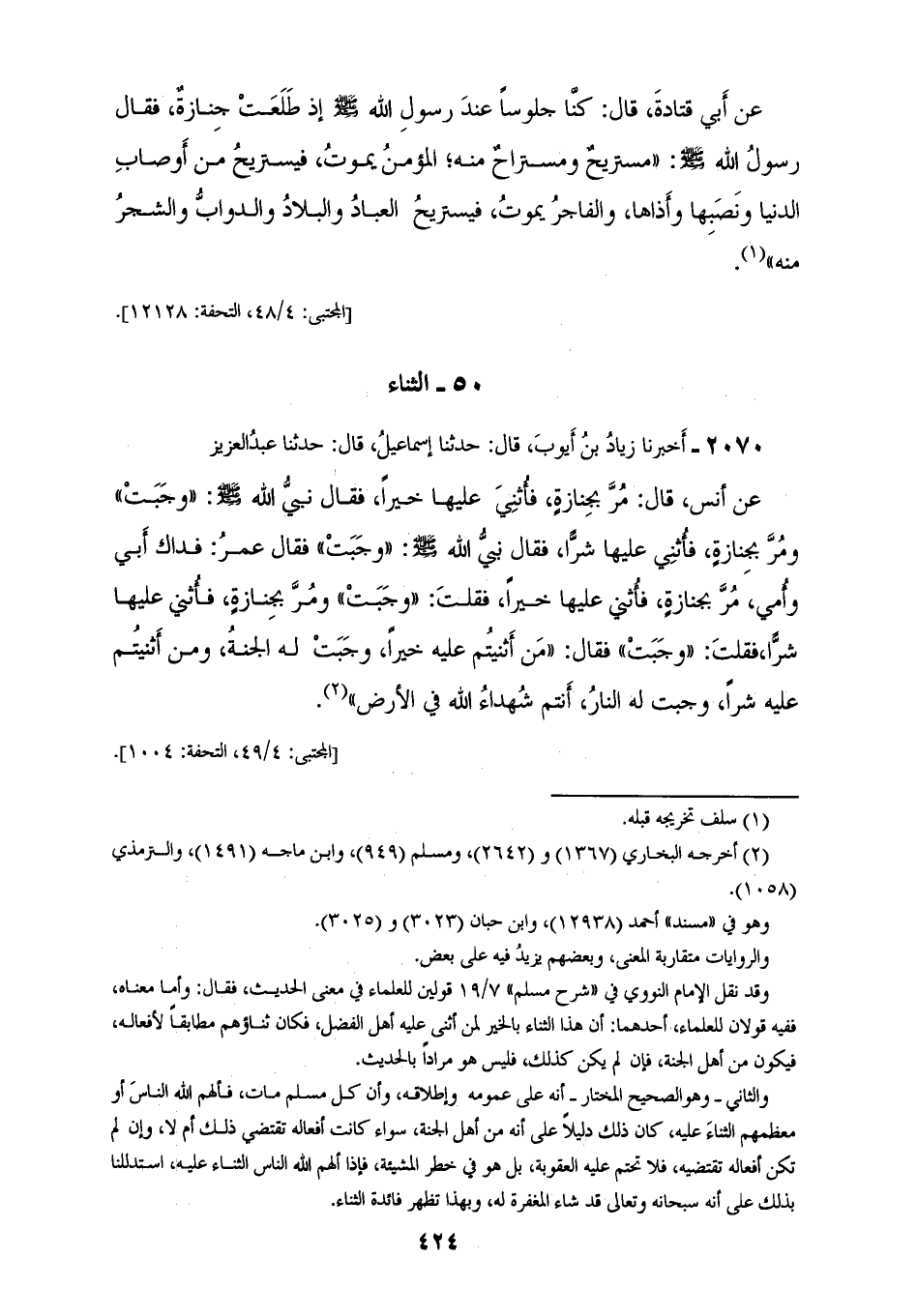 2069 - أَخْبَرَنِي مُحَمَّدُ بْنُ وَهْبٍ الْحَرَّانِيُّ قَالَ: حَدَّثَنَا مُحَمَّدُ بْنُ سَلَمَةَ، عَنْ أَبِي عَبْدِ الرَّحِيمِ قَالَ: حَدَّثَنِي زَيْدٌ، وَهُوَ ابْنُ أَبِي أُنَيْسَةَ، عَنْ وَهْبِ بْنِ كَيْسَانَ، عَنْ مَعْبَدِ بْنِ كَعْبٍ، عَنْ أَبِي قَتَادَةَ، قَالَ: كُنَّا جُلُوسًا عِنْدَ رَسُولِ اللهِ صَلَّى اللهُ عَلَيْهِ وَسَلَّمَ إِذْ طَلَعَتْ جِنَازَةٌ فَقَالَ رَسُولُ اللهِ صَلَّى اللهُ عَلَيْهِ وَسَلَّمَ: «§مُسْتَرِيحٌ وَمُسْتَرَاحٌ مِنْهُ الْمُؤْمِنُ يَمُوتُ فَيَسْتَرِيحُ مِنْ أَوْصَابِ الدُّنْيَا، وَنَصَبِهَا وَأَذَاهَا وَالْفَاجِرُ يَمُوتُ فَيَسْتَرِيحُ الْعِبَادُ وَالْبِلَادُ وَالدَّوَابُّ وَالشَّجَرُ مِنْهُ»