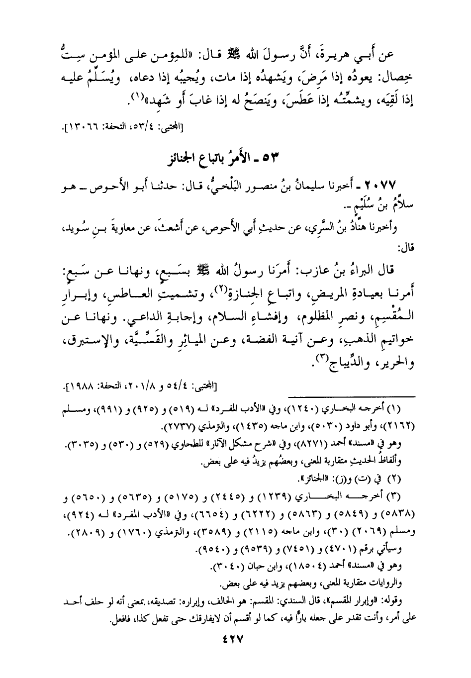 2077 - أَخْبَرَنَا سُلَيْمَانُ بْنُ مَنْصُورٍ الْبَلْخِيُّ قَالَ: حَدَّثَنَا أَبُو الْأَحْوَصِ، هُوَ سَلَّامُ بْنُ سُلَيْمٍ، وَأخبرنا هَنَّادُ بْنُ السَّرِيِّ، عَنْ حَدِيثُ أَبِي الْأَحْوَصِ، عَنْ أَشْعَثَ، عَنْ مُعَاوِيَةَ بْنِ سُوَيْدٍ قَالَ: قَالَ الْبَرَاءُ بْنُ عَازِبٍ: «§أَمَرَنَا رَسُولُ اللهِ صَلَّى اللهُ عَلَيْهِ وَسَلَّمَ بِسَبْعٍ، وَنَهَانَا عَنْ سَبْعٍ أَمَرَنَا بِعِيَادَةِ الْمَرِيضِ، وَاتِّبَاعِ الْجَنَازَةِ، وَتَشْمِيتِ الْعَاطِسِ، وَإِبْرَارِ الْمُقْسِمِ وَنَصْرِ الْمَظْلُومِ، وَإِفْشَاءِ السَّلَامِ، وَإِجَابَةِ الدَّاعِي، وَنَهَانَا عَنْ خَوَاتِيمِ الذَّهَبِ، وَعَنْ آنِيَةِ الْفِضَّةِ، وَعَنِ الْمَيَاثِرِ وَالْقَسِّيَّةِ، وَالْإِسْتَبْرَقِ، وَالْحَرِيرِ، وَالدِّيبَاجِ»