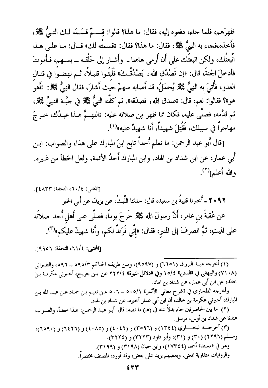 2091 - أَخْبَرَنَا سُوَيْدُ بْنُ نَصْرٍ قَالَ: أَخْبَرَنَا عَبْدُ اللهِ بْنُ الْمُبَارَكِ، عَنِ ابْنِ جُرَيْجٍ قَالَ: أَخْبَرَنِي عِكْرِمَةُ بْنُ خَالِدٍ، أَنَّ ابْنَ أَبِي عَمَّارٍ، أَخْبَرَهُ عَنْ شَدَّادِ بْنِ الْهَادِ، أَنَّ رَجُلًا، مِنَ الْأَعْرَابِ جَاءَ النَّبِيَّ صَلَّى اللهُ عَلَيْهِ وَسَلَّمَ فَآمَنَ بِهِ وَاتَّبَعَهُ ثُمَّ قَالَ: أُهَاجِرُ مَعَكَ فَأَوْصَى بِهِ النَّبِيُّ صَلَّى اللهُ عَلَيْهِ وَسَلَّمَ بَعْضَ أَصْحَابِهِ، فَلَمَّا كَانَتْ غَزْوَةٌ، غَنِمَ النَّبِيُّ صَلَّى اللهُ عَلَيْهِ وَسَلَّمَ سَبْيًا «فَقَسَمَ وَقَسَمَ لَهُ» فَأَعْطَى أَصْحَابَهَ مَا قَسَمَ لَهُ، وَكَانَ يَرْعَى ظَهْرَهُمْ فَلَمَّا جَاءَ دَفَعُوهُ إِلَيْهِ فَقَالَ: مَا هَذَا؟ قَالُوا: قِسْمٌ قَسَمَهُ لَكَ النَّبِيُّ صَلَّى اللهُ عَلَيْهِ وَسَلَّمَ، فَأَخَذَهُ فَجَاءَ بِهِ النَّبِيُّ صَلَّى اللهُ عَلَيْهِ وَسَلَّمَ فَقَالَ: مَا هَذَا فَقَالَ: «قَسَمْتُهُ لَكَ» قَالَ: مَا عَلَى هَذَا اتَّبَعْتُكَ، وَلَكِنِ اتَّبَعْتُكَ عَلَى أَنْ أُرْمَى هَاهُنَا وَأَشَارَ إِلَى حَلْقِهِ بِسَهْمٍ، فَأَمُوتَ فَأَدْخُلَ الْجَنَّةَ قَالَ: «إِنْ تَصْدُقِ اللهَ يَصْدُقْكَ فَلَبِثُوا قَلِيلًا» ثُمَّ نَهَضُوا فِي قِتَالِ الْعَدُوِّ فَأُتِيَ بِهِ النَّبِيُّ صَلَّى اللهُ عَلَيْهِ وَسَلَّمَ يُحْمَلُ قَدْ أَصَابَهُ سَهْمٌ حَيْثُ أَشَارَ فَقَالَ النَّبِيُّ صَلَّى اللهُ عَلَيْهِ وَسَلَّمَ: «أَهُوَ هُوَ» فَقَالُوا نَعَمْ قَالَ: «صَدَقَ اللهَ فَصَدَّقَهُ» ثُمَّ كَفَّنَهُ النَّبِيُّ صَلَّى اللهُ عَلَيْهِ وَسَلَّمَ فِي جُبَّةِ النَّبِيِّ صَلَّى اللهُ عَلَيْهِ وَسَلَّمَ، ثُمَّ قَدَّمَهُ فَصَلَّى عَلَيْهِ فَكَانَ مِمَّا ظَهَرَ مِنْ صَلَاتِهِ عَلَيْهِ «§اللهُمَّ هَذَا عَبْدُكَ خَرَجَ مُهَاجِرًا فِي سَبِيلِكَ فَقُتِلَ شَهِيدًا أَنَا شَهِيدٌ عَلَيْهِ» قَالَ أَبُو عَبْدِ الرَّحْمَنِ: مَا نَعْلَمُ أَحَدًا تَابَعَ ابْنَ الْمُبَارَكِ عَلَى هَذَا وَالصَّوَابُ ابْنُ أَبِي عَمَّارٍ، عَنِ ابْنِ شَدَّادِ بْنِ الْهَادِ، وَابْنُ الْمُبَارَكِ أَحَدُ الْأَئِمَّةِ وَلَعَلَّ الْخَطَأَ مِنْ غَيْرِهِ وَاللهُ أَعْلَمُ
