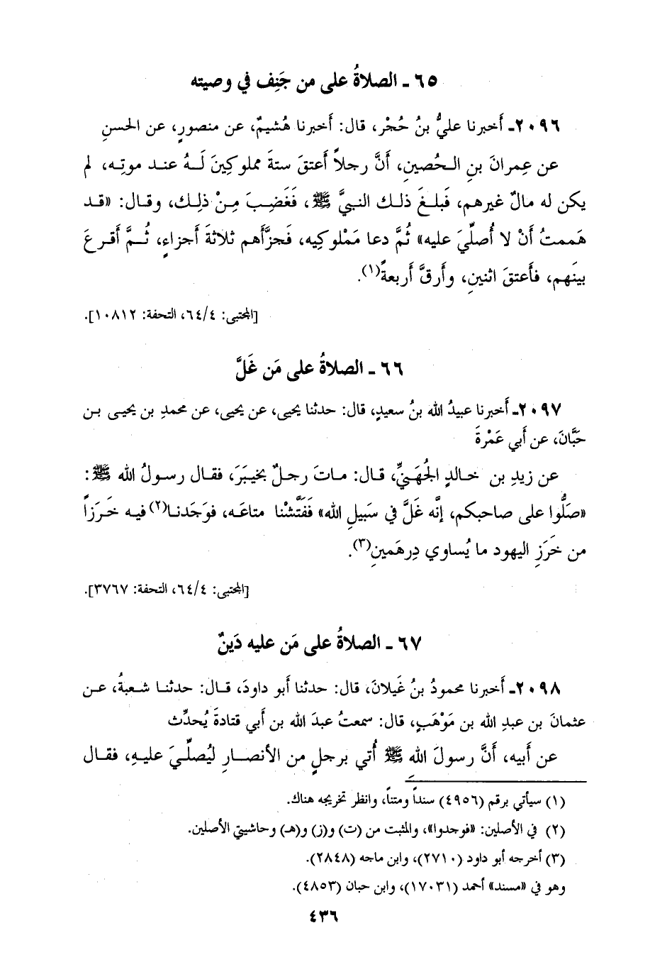 2097 - أَخْبَرَنَا عُبَيْدُ اللهِ بْنُ سَعِيدٍ قَالَ: حَدَّثَنَا يَحْيَى، عَنْ يَحْيَى، عَنْ مُحَمَّدِ بْنِ يَحْيَى بْنِ حِبَّانَ، عَنْ أَبِي عَمْرَةَ، عَنْ زَيْدِ بْنِ خَالِدٍ الْجُهَنِيِّ قَالَ: مَاتَ رَجُلٌ بِخَيْبَرَ فَقَالَ رَسُولُ اللهِ صَلَّى اللهُ عَلَيْهِ وَسَلَّمَ: «§صَلُّوا عَلَى صَاحِبِكُمْ إِنَّهُ غَلَّ فِي سَبِيلِ اللهِ فَفَتَّشْنَا مَتَاعَهُ فَوَجَدْنَا فِيهِ خَرَزًا مِنْ خَرَزِ اليَهُودَ مَا يُسَاوِي دِرْهَمَيْنِ»