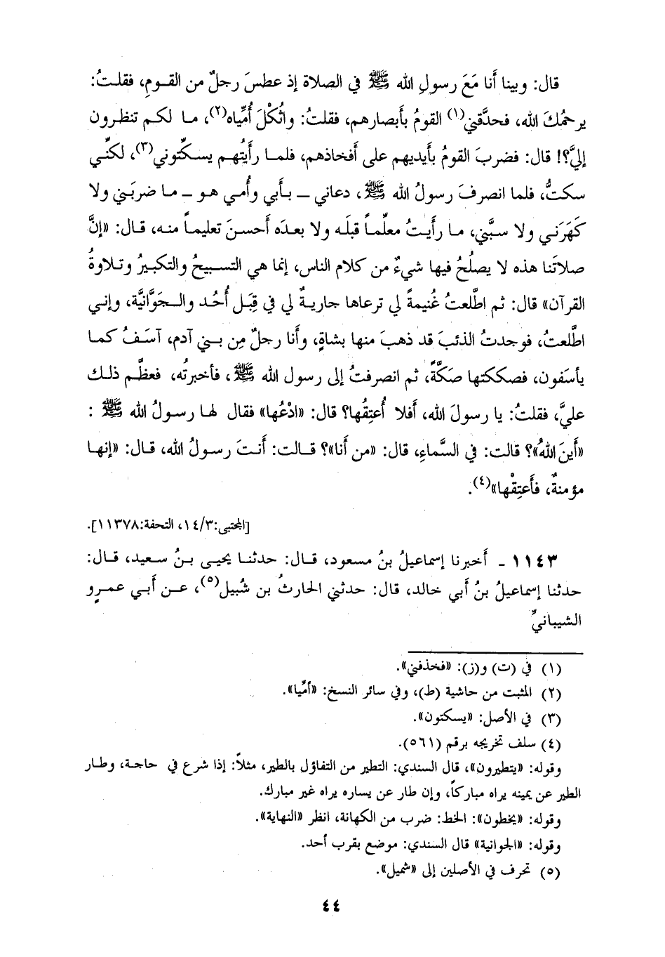 1142 - أَخْبَرَنَا إِسْحَاقُ بْنُ مَنْصُورٍ، قَالَ: حَدَّثَنَا مُحَمَّدُ بْنُ يُوسُفَ، قَالَ: حَدَّثَنِي الْأَوْزَاعِيُّ، قَالَ: حَدَّثَنِي يَحْيَى بْنُ أَبِي كَثِيرٍ، عَنْ هِلَالِ بْنِ أَبِي مَيْمُونَةَ، قَالَ: حَدَّثَنِي عَطَاءُ بْنُ يَسَارٍ، عَنْ مُعَاوِيَةَ بْنِ الْحَكَمِ السَّلَمِيِّ، قَالَ: قُلْتُ: يَا رَسُولَ اللهِ، إِنَّا حَدِيثُ عَهْدٍ بِجَاهِلِيَّةٍ، فَجَاءَ اللهُ بِالْإِسْلَامِ، وَإِنَّ رِجَالًا مِنَّا يَتَطَيَّرُونَ، قَالَ: «ذَاكَ شَيْءٌ يَجِدُونَهُ فِي صُدُورِهِمْ، فَلَا يَصُدَّنَّهُمْ»، وَرِجَالٌ مِنَّا يَأْتُونَ الْكُهَّانَ، قَالَ: «فَلَا يَأْتُوهُمْ»، قَالَ: يَا رَسُولَ اللهِ، وَرِجَالٌ مِنَّا يَخُطُّونَ، قَالَ: «كَانَ نَبِيٌّ مِنَ الْأَنْبِيَاءِ يَخُطُّ، فَمَنْ وَافَقَ خَطُّهُ فَذَاكَ»، قَالَ: وَبَيْنَا أَنَا مَعَ رَسُولِ اللهِ صَلَّى اللهُ عَلَيْهِ وَسَلَّمَ فِي الصَّلَاةِ، إِذْ عَطَسَ رَجُلٌ مِنَ الْقَوْمِ، فَقُلْتُ: يَرْحَمُكَ اللهُ فَحَدَّقَنِي الْقَوْمُ بِأَبْصَارِهِمْ فَقُلْتُ: وَاثُكْلَ أُمِّيَاهُ، مَا لَكُمْ تَنْظُرُونَ إِلَيَّ؟ قَالَ: فَضَرَبَ الْقَوْمُ بِأَيْدِيهِمْ عَلَى أَفْخَاذِهِمْ، فَلَمَّا رَأَيْتُهُمْ يُسَكِّتُونِي لَكِنِّي سَكَتُّ، فَلَمَّا انْصَرَفَ رَسُولُ اللهِ صَلَّى اللهُ عَلَيْهِ وَسَلَّمَ دَعَانِي بِأَبِي وَأُمِّي هُوَ مَا ضَرَبَنِي وَلَا كَهَرَنِي وَلَا سَبَّنِي، مَا رَأَيْتُ مُعَلِّمًا قَبْلَهُ وَلَا بَعْدَهُ أَحْسَنَ تَعْلِيمًا مِنْهُ، قَالَ: «إِنَّ §صَلَاتَنَا هَذِهِ لَا يَصْلُحُ فِيهَا شَيْءٌ مِنْ كَلَامِ النَّاسِ، إِنَّمَا هِيَ التَّسْبِيحُ وَالتَّكْبِيرُ، وَتِلَاوَةُ الْقُرْآنِ»، قَالَ: ثُمَّ اطَّلَعْتُ غَنِيمَةً لِي تَرْعَاهَا جَارِيَةٌ لِي فِي قِبَلِ أُحُدٍ وَالْجَوَّانِيَّةِ، وَإِنِّي اطَّلَعْتُ فَوَجَدْتُ الذِّئْبَ قَدْ ذَهَبَ مِنْهَا بِشَاةٍ، وَأَنَا رَجُلٌ مِنْ بَنِي آدَمَ، آسَفُ كَمَا يَأْسَفُونَ، فَصَكَكْتُهَا صَكَّةً، ثُمَّ انْصَرَفْتُ إِلَى رَسُولِ اللهِ صَلَّى اللهُ عَلَيْهِ وَسَلَّمَ فَأَخْبَرْتُهُ، فَعَظَّمَ ذَلِكَ عَلَيَّ، فَقُلْتُ: يَا رَسُولَ اللهِ، أَفَلَا أَعْتِقُهَا؟، قَالَ: «ادْعُهَا»، فَقَالَ لَهَا رَسُولُ اللهِ صَلَّى اللهُ عَلَيْهِ وَسَلَّمَ: «أَيْنَ اللهُ؟» قَالَتْ: فِي السَّمَاءِ، قَالَ: «مَنْ أَنَا؟» قَالَتْ: أَنْتَ رَسُولُ اللهِ.، قَالَ: «إِنَّهَا مُؤْمِنَةٌ فَأَعْتِقَهَا»