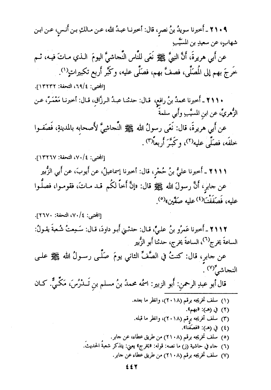 2109 - أَخْبَرَنَا سُوَيْدُ بْنُ نَصْرٍ قَالَ: أَخْبَرَنَا عَبْدُ اللهِ، عَنْ مَالِكِ بْنِ أَنَسٍ، عَنِ ابْنِ شِهَابٍ، عَنْ سَعِيدِ بْنِ الْمُسَيِّبِ، عَنْ أَبِي هُرَيْرَةَ، أَنَّ النَّبِيَّ صَلَّى اللهُ عَلَيْهِ وَسَلَّمَ «§نَعَى لِلنَّاسِ النَّجَاشِيَّ الْيَوْمَ الَّذِي مَاتَ فِيهِ ثُمَّ خَرَجَ بِهِمْ إِلَى الْمُصَلَّى فَصَفَّ بِهِمْ فَصَلَّى عَلَيْهِ وَكَبَّرَ أَرْبَعَ تَكْبِيرَاتٍ»