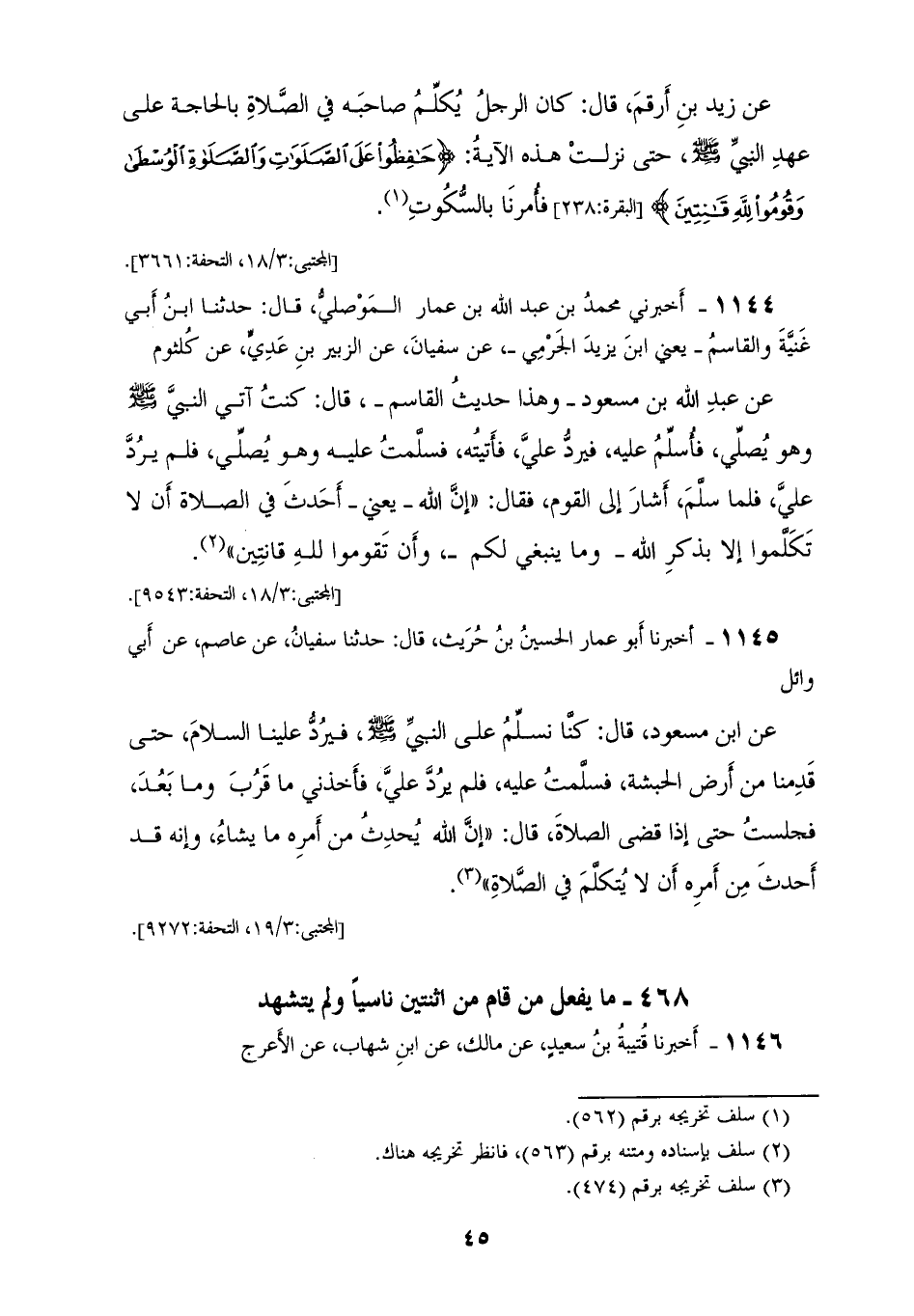 1144 - أَخْبَرَنِي مُحَمَّدُ بْنُ عَبْدِ اللهِ بْنِ عَمَّارٍ الْمَوصِلِيُّ، قَالَ: حَدَّثَنَا ابْنُ أَبِي غَنِيَّةَ، وَالْقَاسِمُ يَعْنِي ابْنَ يَزِيدَ الْجَرْمِيَّ، عَنْ سُفْيَانَ، عَنِ الزُّبَيْرِ بْنِ عَدِيٍّ، عَنْ كُلْثُومٍ، عَنْ عَبْدِ اللهِ بْنِ مَسْعُودٍ، وَهَذَا حَدِيثُ الْقَاسِمِ، قَالَ: كُنْتُ آتِي النَّبِيَّ صَلَّى اللهُ عَلَيْهِ وَسَلَّمَ وَهُوَ يُصَلِّي، فَأَسَلِّمُ عَلَيْهِ، فَيَرُدُّ عَلَيَّ، فَأَتَيْتُهُ، فَسَلَّمْتُ عَلَيْهِ، وَهُوَ يُصَلِّي فَلَمْ يُرِدَّ عَلَيَّ، فَلَمَّا سَلَّمَ أَشَارَ إِلَى الْقَوْمِ، فَقَالَ: «إِنَّ §اللهَ يَعْنِي أَحْدَثَ فِي الصَّلَاةِ، أَنْ لَا تَكَلَّمُوا إِلَّا بِذِكْرِ اللهِ، وَمَا يَنْبَغِي لَكُمْ وَأَنْ تَقُومُوا لِلَّهِ قَانِتِينَ»