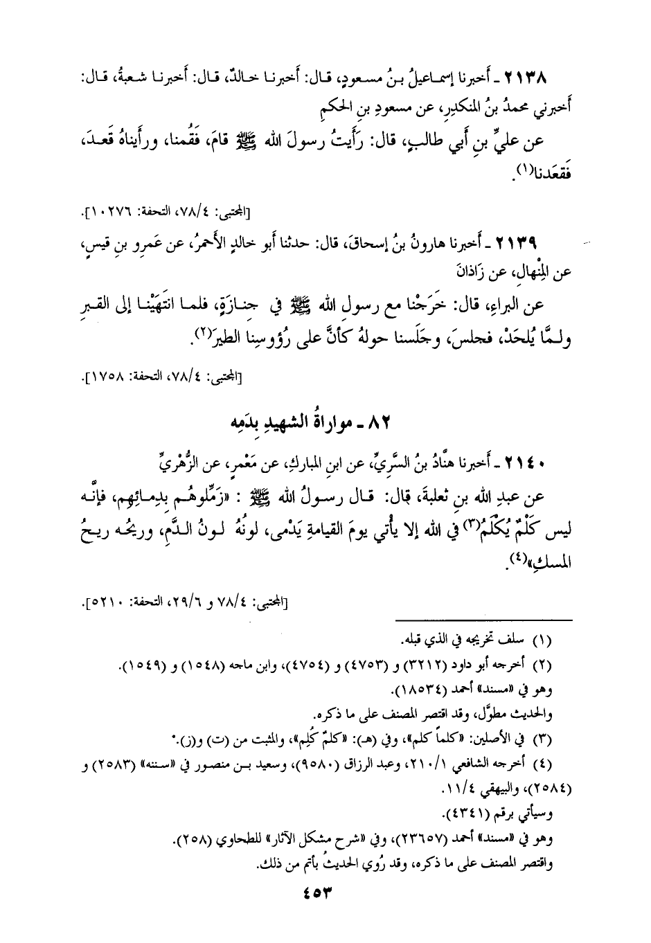2140 - أَخْبَرَنَا هَنَّادُ بْنُ السَّرِيِّ، عَنِ ابْنِ الْمُبَارَكِ، عَنْ مَعْمَرٍ، عَنِ الزُّهْرِيِّ، عَنْ عَبْدِ اللهِ بْنِ ثَعْلَبَةَ قَالَ: قَالَ رَسُولُ اللهِ صَلَّى اللهُ عَلَيْهِ وَسَلَّمَ: «§زَمِّلُوهُمْ بِدِمَائِهِمْ فَإِنَّهُ لَيْسَ كَلْمٌ يُكْلَمُ فِي اللهِ إِلَّا يَأْتِي يَوْمَ الْقِيَامَةِ يَدْمَى، لَوْنُهُ لَوْنُ الدَّمِ وَرِيحُهُ رِيحُ الْمِسْكِ»