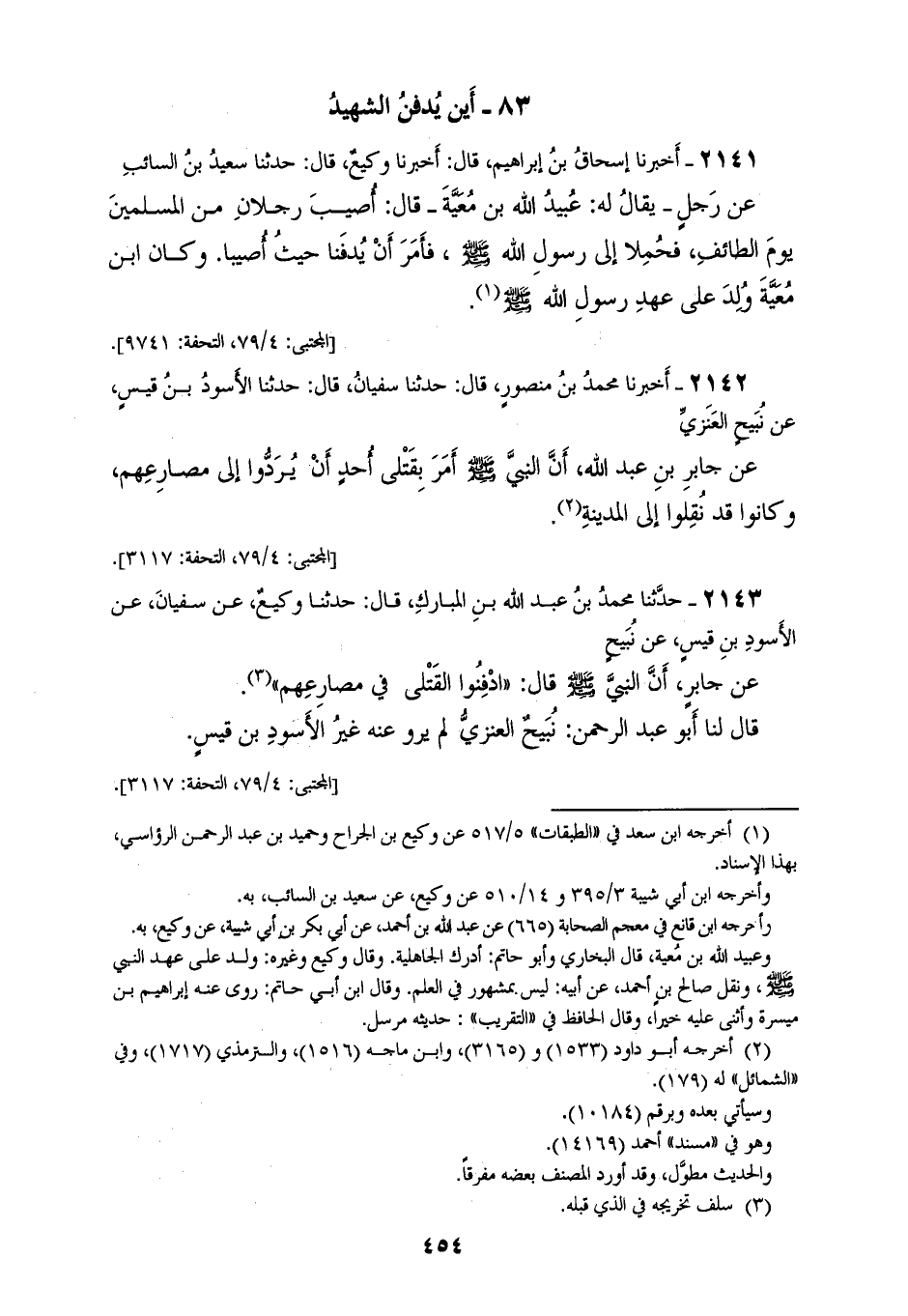 2143 - حَدَّثَنَا مُحَمَّدُ بْنُ عَبْدِ اللهِ بْنِ الْمُبَارَكِ قَالَ: حَدَّثَنَا وَكِيعٍ، عَنْ سُفْيَانَ، عَنِ الْأَسْوَدِ بْنِ قَيْسٍ، عَنْ نُبَيْحٍ، عَنْ جَابِرٍ، أَنَّ النَّبِيَّ صَلَّى اللهُ عَلَيْهِ وَسَلَّمَ قَالَ: «§ادْفِنُوا الْقَتْلَى فِي مَصَارِعِهِمْ» قَالَ لَنَا أَبُو عَبْدِ الرَّحْمَنِ: نُبَيْحٌ الْعَنَزِيُّ لَمْ يَرْوِ عَنْهُ غَيْرُ الْأَسْوَدِ بْنِ قَيْسٍ