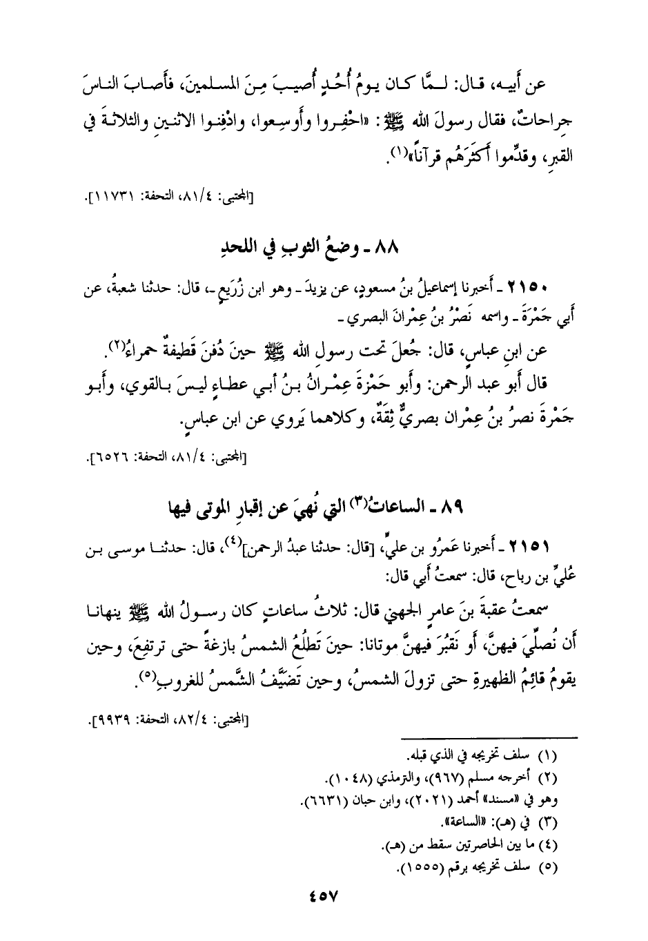 2150 - أَخْبَرَنَا إِسْمَاعِيلُ بْنُ مَسْعُودٍ، عَنْ يَزِيدَ، وَهُوَ ابْنُ زُرَيْعٍ قَالَ: حَدَّثَنَا شُعْبَةُ، عَنْ أَبِي جَمْرَةَ وَاسْمُهُ نَصْرُ بْنُ عِمْرَانَ الْبَصْرِيُّ عَنِ ابْنِ عَبَّاسٍ قَالَ: «§جُعِلَ تَحْتَ رَسُولِ اللهِ صَلَّى اللهُ عَلَيْهِ وَسَلَّمَ حِينَ دُفِنَ قَطِيفَةٌ حَمْرَاءُ» قَالَ أَبُو عَبْدِ الرَّحْمَنِ: وَأَبُو حَمْزَةَ عِمْرَانُ بْنُ أَبِي عَطَاءٍ لَيْسَ بِالْقَوِيِّ وَأَبُو جَمْرَةَ نَصْرُ بْنُ عِمْرَانَ بَصْرِيٌّ ثِقَةٌ وَكِلَاهُمَا يَرْوِي عَنِ ابْنِ عَبَّاسٍ السَّاعَاتُ الَّتِي نُهِيَ عَنْ إِقْبَارِ الْمَوْتَى فِيهَا