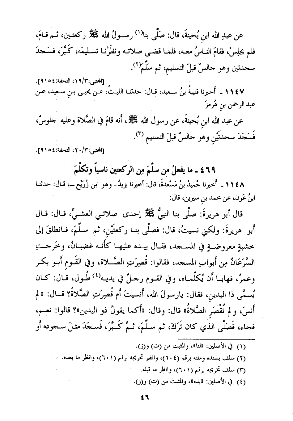 1148 - أَخْبَرَنَا حُمَيْدُ بْنُ مَسْعَدَةَ، قَالَ: أَخْبَرَنَا يَزِيدُ، وَهُو ابْنُ زُرَيْعٍ، قَالَ: حَدَّثَنَا ابْنُ عَوْنٍ، عَنْ مُحَمَّدِ بْنِ سِيرِينَ، قَالَ: قَالَ أَبُو هُرَيْرَةَ، صَلَّى بِنَا النَّبِيُّ صَلَّى اللهُ عَلَيْهِ وَسَلَّمَ إِحْدَى صَلَاتِي الْعَشِيِّ قَالَ: قَالَ أَبُو هُرَيْرَةَ: وَلَكِنِّي نَسِيتُ، قَالَ: «فَصَلَّى بِنَا رَكْعَتَيْنِ، ثُمَّ سَلَّمَ فَانْطَلَقَ إِلَى خَشَبَةٍ مَعْرُوضَةٍ، فِي الْمَسْجِدِ، فَقَالَ بِيَدِهِ عَلَيْهَا كَأَنَّهُ غَضْبَانُ، وَخَرَجَتِ السَّرَعَانُ مِنْ أَبْوَابِ الْمَسْجِدِ،» فَقَالُوا: قَصُرَتِ الصَّلَاةُ، وَفِي الْقَوْمِ أَبُو بَكْرٍ وَعُمَرُ، فَهَابَا أَنْ يُكَلِّمَاهُ، وَفِي الْقَوْمِ رَجُلٌ فِي يَدَيْهِ طُولٌ.، قَالَ: كَانَ يُسَمَّى ذَا الْيَدَيْنِ، فَقَالَ: يَا رَسُولَ اللهِ أَنَسِيتَ أَمْ قَصُرَتِ الصَّلَاةُ؟، قَالَ: «لَمْ أَنَسَ، وَلَمْ تُقْصَرِ الصَّلَاةُ»، قَالَ: وَقَالَ: " أَكَمَا يَقُولُ: ذُو الْيَدَيْنِ؟ " قَالُوا: نَعَمْ، فَجَاءَ «§فَصَلَّى الَّذِي كَانَ تَرَكَ، ثُمَّ سَلِمَ، ثُمَّ كَبَّرَ، فَسَجَدَ مِثْلَ سُجُودِهِ، أَوْ أَطْوَلَ، ثُمَّ رَفَعَ رَأْسَهُ وَكَبِّرَ، ثُمَّ كَبَّرَ، ثُمَّ سَجَدَ مِثْلَ سُجُودِهِ، أَوْ أَطْوَلَ، ثُمَّ رَفَعَ رَأْسَهُ فَكَبَّرَ»