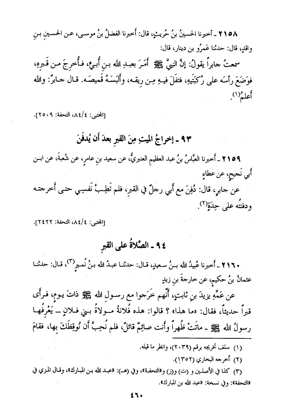 2158 - أَخْبَرَنَا الْحُسَيْنُ بْنُ حُرَيْثٍ قَالَ: أَخْبَرَنَا الْفَضْلُ بْنُ مُوسَى، عَنِ الْحُسَيْنِ بْنِ وَاقِدٍ، قَالَ: حَدَّثَنَا عَمْرُو بْنُ دِينَارٍ قَالَ: سَمِعْتُ جَابِرًا يَقُولُ: إِنَّ النَّبِيَّ صَلَّى اللهُ عَلَيْهِ وَسَلَّمَ «§أَمَرَ بِعَبْدِ اللهِ بْنِ أُبَيٍّ فَأُخْرِجَ مِنْ قَبْرِهِ فَوَضَعَ رَأْسَهُ عَلَى رُكْبَتَيْهِ فَتَفَلَ فِيهِ مِنْ رِيقِهِ وَأَلْبَسَهُ قَمِيصَهُ» قَالَ جَابِرٌ: وَاللهُ أَعْلَمُ