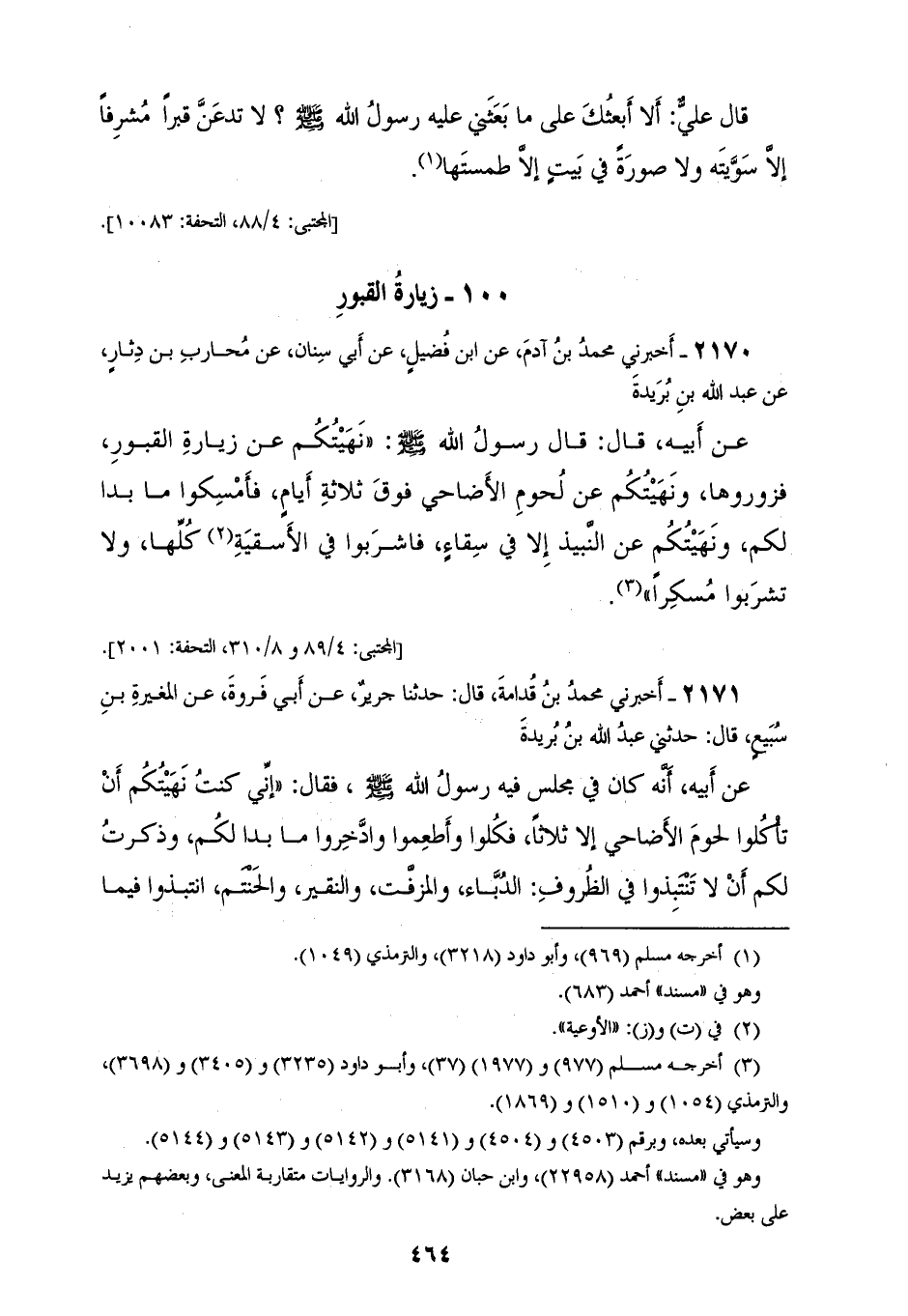 2170 - أَخْبَرَنِي مُحَمَّدُ بْنُ آدَمَ، عَنِ ابْنِ فُضَيْلٍ، عَنْ أَبِي سِنَانٍ، عَنْ مُحَارِبِ بْنِ دِثَارٍ، عَنْ عَبْدِ اللهِ بْنِ بُرَيْدَةَ، عَنْ أَبِيهِ قَالَ: قَالَ رَسُولُ اللهِ صَلَّى اللهُ عَلَيْهِ وَسَلَّمَ: «§نَهَيْتُكُمْ عَنْ زِيَارَةِ الْقُبُورِ فَزُورُوهَا، وَنَهَيْتُكُمْ عَنْ لُحُومِ الْأَضَاحِيِّ فَوْقَ ثَلَاثَةِ أَيَّامٍ فَأَمْسِكُوا مَا بَدَا لَكُمْ، وَنَهَيْتُكُمْ عَنِ النَّبِيِّذِ إِلَّا فِي سِقَاءٍ فَاشْرَبُوا فِي الْأسْقِيَةِ كُلِّهَا، وَلَا تَشْرَبُوا مُسْكِرًا»