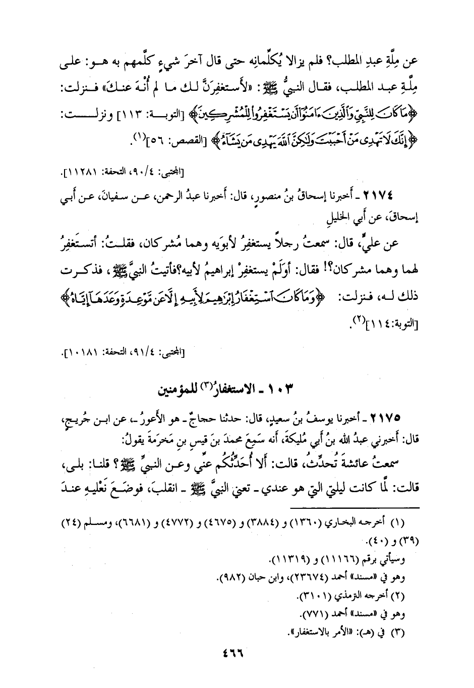 2174 - أَخْبَرَنَا إِسْحَاقُ بْنُ مَنْصُورٍ قَالَ: أَخْبَرَنَا عَبْدُ الرَّحْمَنِ، عَنْ سُفْيَانَ، عَنْ أَبِي إِسْحَاقَ، عَنْ أَبِي الْخَلِيلِ، عَنْ عَلِيٍّ قَالَ: سَمِعْتُ رَجُلًا، يَسْتَغْفِرُ لِأَبَوَيْهِ وَهُمَا مُشْرِكَانِ فَقُلْتُ: أَتَسْتَغْفِرُ لَهُمَا وَهُمَا مُشْرِكَانِ؟ فَقَالَ: §أَوَلَمْ يَسْتَغْفِرْ إِبْرَاهِيمُ لِأَبِيهِ " فَأَتَيْتُ النَّبِيَّ صَلَّى اللهُ عَلَيْهِ وَسَلَّمَ فَذَكَرْتُ ذَلِكَ لَهُ فَنَزَلَتْ {وَمَا كَانَ اسْتِغْفَارُ إِبْرَاهِيمَ لِأَبِيهِ إِلَّا عَنْ مَوْعِدَةٍ وَعَدَهَا إِيَّاهُ} [التوبة: 114]