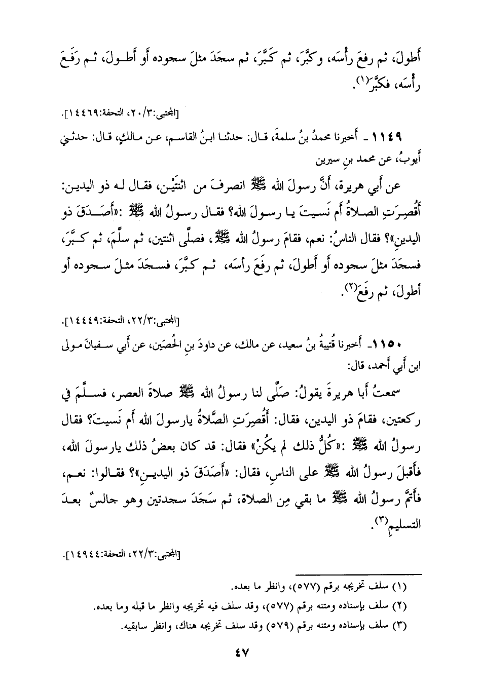1149 - أَخْبَرَنَا مُحَمَّدُ بْنُ سَلَمَةَ، قَالَ: حَدَّثَنَا ابْنُ الْقَاسِمِ، عَنْ مَالِكٍ، قَالَ: حَدَّثَنِي أَيُّوبُ، عَنْ مُحَمَّدِ بْنِ سِيرِينَ، عَنْ أَبِي هُرَيْرَةَ، أَنَّ رَسُولَ اللهِ صَلَّى اللهُ عَلَيْهِ وَسَلَّمَ انْصَرَفَ مِنَ اثْنَتَيْنِ، فَقَالَ: لَهُ ذُو الْيَدَيْنِ أَقَصُرَتِ الصَّلَاةُ أَمْ نَسِيتَ يَا رَسُولَ اللهِ؟، فَقَالَ رَسُولُ اللهِ صَلَّى اللهُ عَلَيْهِ وَسَلَّمَ: «أَصَدَقَ ذُو الْيَدَيْنِ»، فَقَالَ النَّاسُ: نَعَمْ، فَقَامَ رَسُولُ اللهِ صَلَّى اللهُ عَلَيْهِ وَسَلَّمَ «§فَصَلَّى اثْنَتَيْنِ، ثُمَّ سَلَّمَ، ثُمَّ كَبَّرَ، فَسَجَدَ مِثْلَ سُجُودِهِ، أَوْ أَطْوَلَ، ثُمَّ رَفَعَ رَأْسَهُ، ثُمَّ كَبَّرَ فَسَجَدَ مِثْلَ سُجُودِهِ، أَوْ أَطْوَلَ ثُمَّ رَفَعَ»