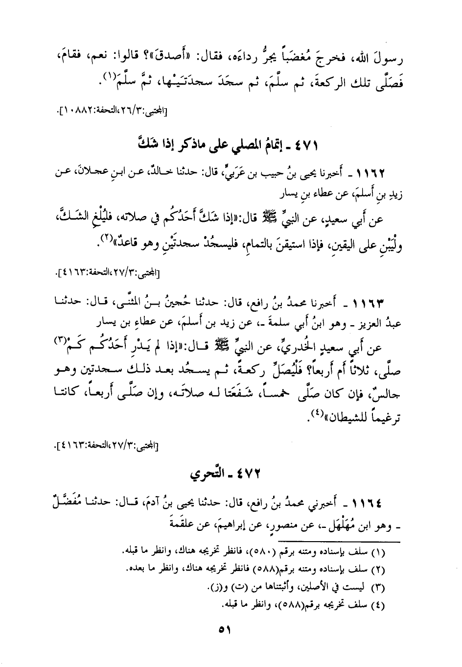 1163 - أَخْبَرَنَا مُحَمَّدُ بْنُ رَافِعٍ، قَالَ: حَدَّثَنَا حُجَيْنُ بْنُ الْمُثَنَّى، قَالَ: حَدَّثَنَا عَبْدُ الْعَزِيزِ، وَهُوَ ابْنُ أَبِي سَلَمَةَ، عَنْ زَيْدِ بْنِ أَسْلَمَ، عَنْ عَطَاءِ بْنِ يَسَارٍ، عَنْ أَبِي سَعِيدٍ الْخُدْرِيِّ، عَنِ النَّبِيِّ صَلَّى اللهُ عَلَيْهِ وَسَلَّمَ قَالَ: «§إِذَا لَمْ يَدْرِ أَحَدُكُمْ، كَمْ صَلَّى ثَلَاثًا أَمْ أَرْبَعًا، فَلْيُصَلِّ رَكْعَةً، ثُمَّ يَسْجُدْ بَعْدَ ذَلِكَ سَجْدَتَيْنِ، وَهُوَ جَالِسٌ، فَإِنْ كَانَ صَلَّى خَمْسًا، شَفَعَتَا لَهُ صَلَاتَهُ، وَإِنْ صَلَّى أَرْبَعًا كَانَتَا تَرْغِيمًا لِلشَّيْطَانِ»