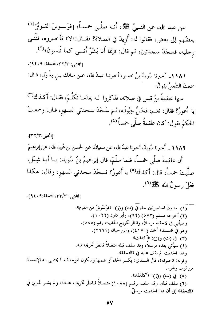1180 - أَخْبَرَنَا مُحَمَّدُ بْنُ رَافِعٍ، حَدَّثَنَا يَحْيَى بْنُ آدَمَ، حَدَّثَنَا مُفَضَّلٌ، وَهُوَ ابْنُ مُهَلْهِلٍ، عَنِ الْحَسَنِ بْنِ عُبَيْدِ اللهِ، عَنْ إِبْرَاهِيمَ بْنِ سُوَيْدٍ، قَالَ: صَلَّى عَلْقَمَةُ خَمْسًا فَقِيلَ لَهُ، فَقَالَ: مَا فَعَلْتُ؟ فَقُلْتُ بِرَأْسِي: بَلَى، قَالَ: وَأَنْتَ يَا أَعْوَرُ؟ فَقُلْتُ: نَعَمْ، فَسَجَدَ سَجْدَتَيْنِ، ثُمَّ حَدَّثَنَا، عَنْ عَبْدِ اللهِ، عَنِ النَّبِيِّ صَلَّى اللهُ عَلَيْهِ وَسَلَّمَ أَنَّهُ صَلَّى خَمْسًا، فَوَسْوَسَ الْقَوْمُ بَعْضُهُمْ إِلَى بَعْضٍ، فَقَالُوا لَهُ: أَزِيدَ فِي الصَّلَاةِ؟، فَقَالَ: «لَا» فَأَخْبَرُوهُ، فَثَنَى رِجْلَيْهِ، فَسَجَدَ سَجْدَتَيْنِ، ثُمَّ قَالَ: «§إِنَّمَا أَنَا بِشْرٌ أَنْسَى كَمَا تَنْسَوْنَ»