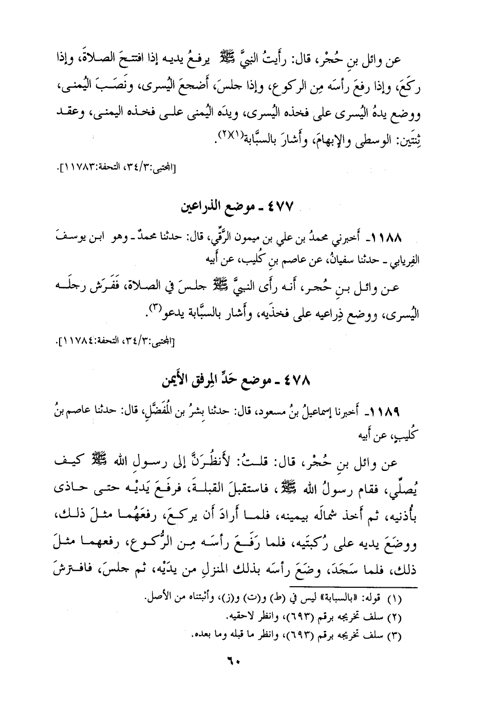 1187 - أَخْبَرَنَا قُتَيْبَةُ، قَالَ: حَدَّثَنَا سُفْيَانُ، عَنْ عَاصِمِ بْنِ كُلَيْبٍ، عَنْ أَبِيهِ، عَنْ وَائِلِ بْنِ حُجْرٍ، قَالَ: رَأَيْتُ النَّبِيَّ صَلَّى اللهُ عَلَيْهِ وَسَلَّمَ يَرْفَعُ يَدَيْهِ: " §إِذَا افْتَتَحَ الصَّلَاةَ، وَإِذَا رَكَعَ، وَإِذَا رَفَعَ رَأْسَهُ مِنَ الرُّكُوعِ، وَإِذَا جَلَسَ أَضْجَعَ الْيُسْرَى وَنَصَبَ الْيُمْنَى، وَوَضَعَ يَدَهُ الْيُسْرَى عَلَى فَخِذِهِ الْيُسْرَى، وَيَدَهُ الْيُمْنَى عَلَى فَخِذِهِ الْيُمْنَى، وَعَقَدَ ثِنْتَيْنِ: الْوُسْطَى وَالْإِبْهَامُ، وَأَشَارَ بِالسَّبَّابَةِ "
