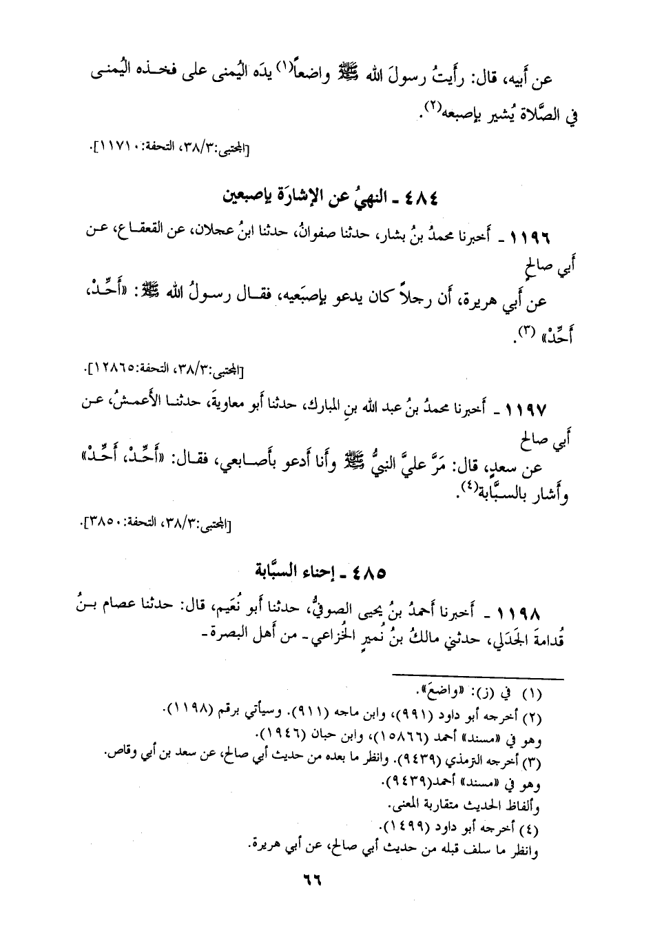 1198 - أَخْبَرَنَا أَحْمَدُ بْنُ يَحْيَى الصُّوفِيُّ، حَدَّثَنَا أَبُو نُعَيْمٍ، قَالَ: حَدَّثَنَا عِصَامُ بْنُ قُدَامَةَ الْجَدَلِيُّ، حَدَّثَنِي مَالِكُ بْنُ نُمَيْرٍ الْخُزَاعِيُّ، مِنْ أَهْلِ الْبَصْرَةِ، أَنَّ أَبَاهُ حَدَّثَهُ أَنَّهُ رَأَى رَسُولَ اللهِ صَلَّى اللهُ عَلَيْهِ وَسَلَّمَ «§قَاعِدًا فِي الصَّلَاةِ، وَاضِعًا ذِرَاعَهُ الْيُمْنَى عَلَى فَخِذِهِ الْيُمْنَى، رَافِعًا إِصْبُعَهُ السَّبَّابَةَ، قَدْ أَحْنَاهَا شَيْئًا وَهُوَ يَدْعُو»