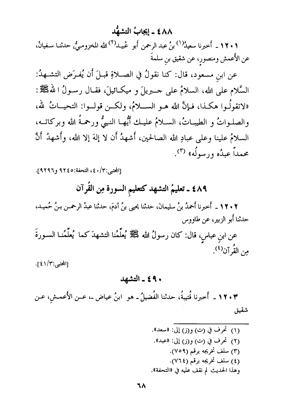 1202 - أَخْبَرَنَا أَحْمَدُ بْنُ سُلَيْمَانَ، حَدَّثَنَا يَحْيَى بْنُ آدَمَ، حَدَّثَنَا عَبْدُ الرَّحْمَنِ بْنُ حُمَيْدٍ، حَدَّثَنَا أَبُو الزُّبَيْرِ، عَنْ طَاوُسٍ، عَنِ ابْنِ عَبَّاسٍ، قَالَ: كَانَ رَسُولُ اللهِ صَلَّى اللهُ عَلَيْهِ وَسَلَّمَ «§يُعَلِّمُنَا التَّشَهُّدَ، كَمَا يُعَلِّمُنَا السُّورَةَ مِنَ الْقُرْآنِ»