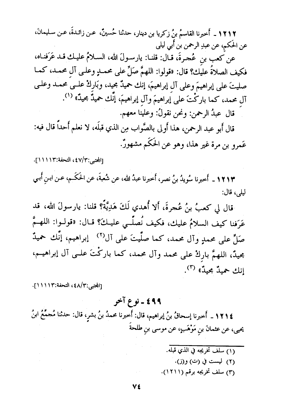 1212 - أَخْبَرَنَا الْقَاسِمُ بْنُ زَكَرِيَّا بْنُ دِينَارٍ، حَدَّثَنَا حُسَيْنٌ، عَنْ زَائِدَةَ، عَنْ سُلَيْمَانَ، عَنِ الْحَكَمِ، عَنْ عَبْدِ الرَّحْمَنِ بْنِ أَبِي لَيْلَى، عَنْ كَعْبِ بْنِ عُجْرَةَ قَالَ: قُلْنَا: يَا رَسُولَ اللهِ، السَّلَامُ عَلَيْكَ قَدْ عَرَفْنَاهُ، فَكَيْفَ الصَّلَاةُ عَلَيْكَ؟، قَالَ: " قُولُوا: §اللهُمَّ صَلِّ عَلَى مُحَمَّدٍ، وَعَلَى آلِ مُحَمَّدٍ، كَمَا صَلَّيْتَ عَلَى إِبْرَاهِيمَ، وَعَلَى آلِ إِبْرَاهِيمَ، إِنَّكَ حَمِيدٌ مَجِيدٌ، وَبَارِكْ عَلَى مُحَمَّدٍ، وَعَلَى آلِ مُحَمَّدٍ، كَمَا بَارَكْتَ عَلَى إِبْرَاهِيمَ، وَآلِ إِبْرَاهِيمَ، إِنَّكَ حَمِيدٌ مَجِيدٌ " قَالَ عَبْدُ الرَّحْمَنِ: وَنَحْنُ نَقُولُ: وَعَلَيْنَا مَعَهُمْ، قَالَ أَبُو عَبْدِ الرَّحْمَنِ: هَذَا أَوْلَى بِالصَّوَابِ مِنَ الَّذِي قَبْلَهُ، لَا نَعْلَمُ أَحَدًا قَالَ فِيهِ عَمْرُو بْنُ مُرَّةَ غَيْرَ هَذَا، وَهُو عَنِ الْحَكَمِ مَشْهُورٌ