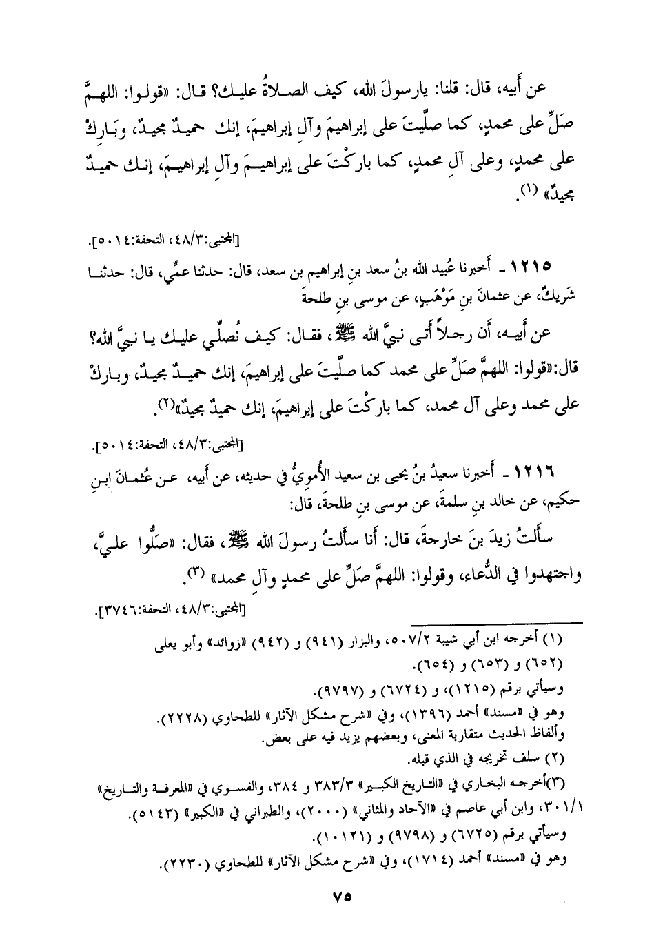 1214 - أَخْبَرَنَا إِسْحَاقُ بْنُ إِبْرَاهِيمَ، قَالَ: أَخْبَرَنَا مُحَمَّدُ بْنُ بِشْرٍ، قَالَ: حَدَّثَنَا مُجَمِّعُ بْنُ يَحْيَى، عَنْ عُثْمَانَ بْنِ مَوْهَبٍ، عَنْ مُوسَى بْنِ طَلْحَةَ، عَنْ أَبِيهِ، قَالَ: قُلْنَا يَا رَسُولَ اللهِ، كَيْفَ الصَّلَاةُ عَلَيْكَ؟، قَالَ: «قُولُوا §اللهُمَّ صَلِّ عَلَى مُحَمَّدٍ، كَمَا صَلَّيْتَ عَلَى إِبْرَاهِيمَ، وَآلِ إِبْرَاهِيمَ، إِنَّكَ حَمِيدٌ مَجِيدٌ، وَبَارِكْ عَلَى مُحَمَّدٍ، وَعَلَى آلِ مُحَمَّدٍ، كَمَا بَارَكْتَ عَلَى إِبْرَاهِيمَ، وَآلِ إِبْرَاهِيمَ إِنَّكَ حَمِيدٌ مَجِيدٌ»