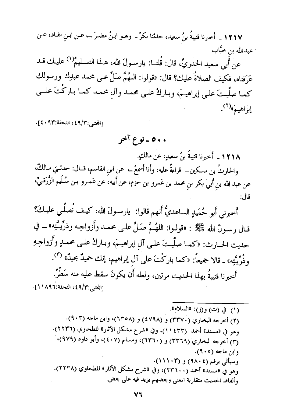 1218 - أَخْبَرَنَا قُتَيْبَةُ بْنُ سَعِيدٍ، عَنْ مَالِكٍ، وَالْحَارِثُ بْنُ مِسْكِينٍ، قِرَاءَةً عَلَيْهِ وَأنا أَسْمَعُ، عَنِ ابْنِ الْقَاسِمِ، قَالَ: حَدَّثَنِي مَالِكٌ، عَنْ عَبْدِ اللهِ بْنِ أَبِي بَكْرِ بْنِ مُحَمَّدِ بْنِ عَمْرِو بْنِ حَزْمٍ، عَنْ أَبِيهِ، عَنْ عَمْرِو بْنِ سُلَيْمٍ الزُّرَقِيِّ، قَالَ: أَخْبَرَنِي أَبُو حُمَيْدٍ السَّاعِدِيُّ، أَنَّهُمْ قَالُوا: يَا رَسُولَ اللهِ كَيْفَ نُصَلِّي عَلَيْكَ؟، قَالَ رَسُولُ اللهِ صَلَّى اللهُ عَلَيْهِ وَسَلَّمَ: «قُولُوا §اللهُمَّ صَلِّ عَلَى مُحَمَّدٍ، وَأَزْوَاجِهِ، وَذُرِّيَّتِهِ» فِي حَدِيثِ الْحَارِثِ «كَمَا صَلَّيْتَ عَلَى آلِ إِبْرَاهِيمَ، وَبَارِكْ عَلَى مُحَمَّدٍ، وَأَزْوَاجِهِ، وَذُرِّيَّتِهِ» قَالَا جَمِيعًا «كَمَا بَارَكْتَ عَلَى آلِ إِبْرَاهِيمَ، إِنَّكَ حَمِيدٌ مَجِيدٌ»، أَخْبَرَنَا قُتَيْبَةُ بِهَذَا الْحَدِيثِ مَرَّتَيْنِ، وَلَعَلَّهُ أَنْ يَكُونَ سَقَطَ عَلَيْهِ مِنْهُ سَطْرٌ