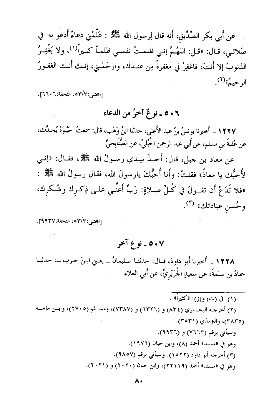 1227 - أَخْبَرَنَا يُونُسُ بْنُ عَبْدِ الْأَعْلَى، حَدَّثَنَا ابْنُ وَهْبٍ، قَالَ: سَمِعْتُ حَيْوَةَ، يُحَدِّثُ، عَنْ عُقْبَةَ بْنِ مُسْلِمٍ، عَنْ أَبِي عَبْدِ الرَّحْمَنِ الْحُبُلِيِّ، عَنْ الصُّنَابِحِيّ، عَنْ مُعَاذِ بْنِ جَبَلٍ، قَالَ: أَخَذَ بِيَدِي رَسُولُ اللهِ صَلَّى اللهُ عَلَيْهِ وَسَلَّمَ، فَقَالَ: «إِنِّي لَأُحِبُّكَ يَا مُعَاذُ»، فَقُلْتُ: وَأَنَا أُحِبُّكُ يَا رَسُولَ اللهِ، فَقَالَ رَسُولُ اللهِ صَلَّى اللهُ عَلَيْهِ وَسَلَّمَ: «§فَلَا تَدَعْ أَنْ تَقُولَ فِي كُلِّ صَلَاةٍ رَبِّ أَعِنِّي عَلَى ذِكْرِكَ، وَشُكْرِكَ، وَحَسَنِ عِبَادَتِكَ»