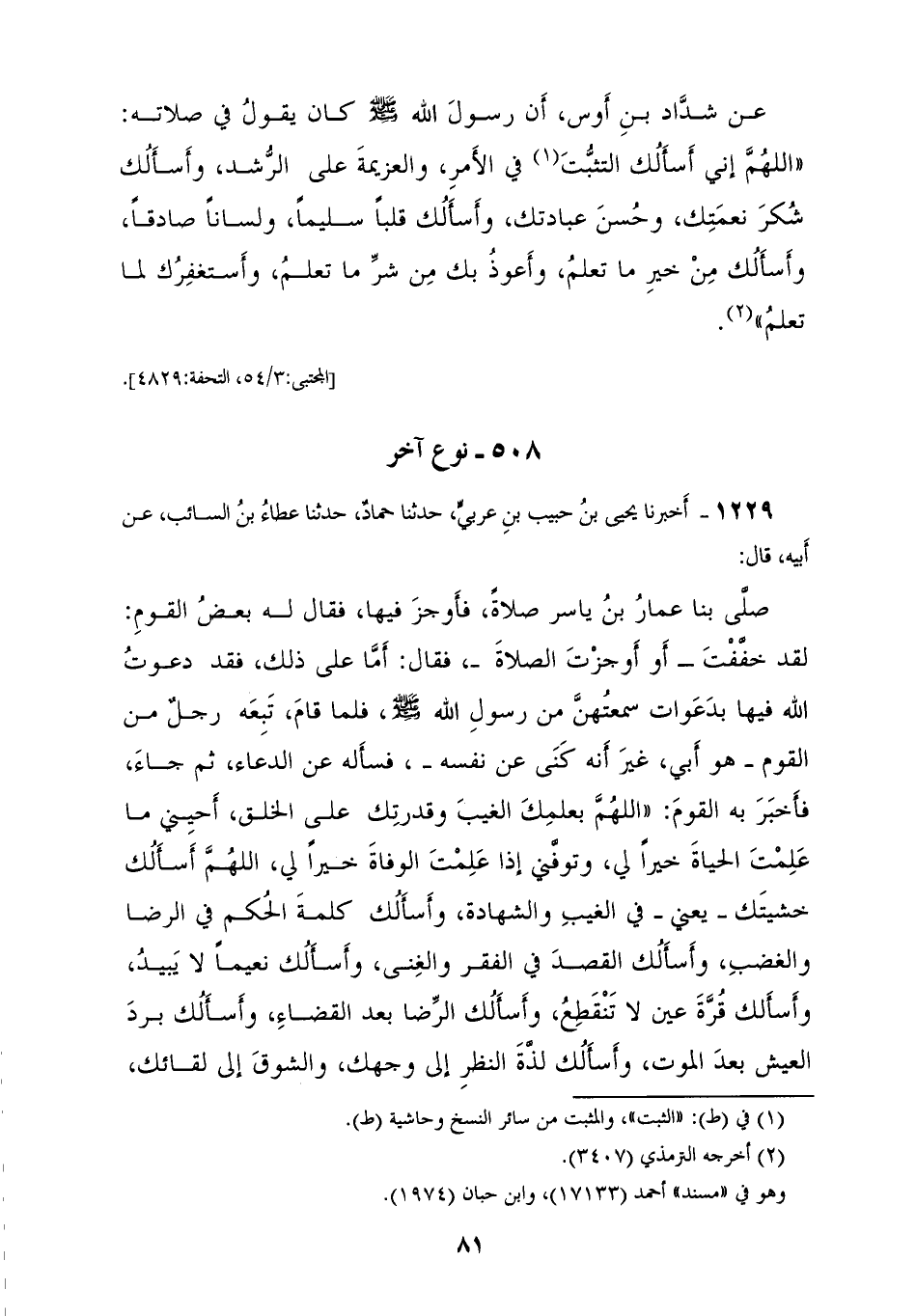 1229 - أَخْبَرَنَا يَحْيَى بْنُ حَبِيبِ بْنِ عَرَبِيٍّ، حَدَّثَنَا حَمَّادُ، حَدَّثَنَا عَطَاءُ بْنُ السَّائِبِ، عَنْ أَبِيهِ، قَالَ: صَلَّى بِنَا عَمَّارُ بْنُ يَاسِرٍ صَلَاةً فَأَوْجَزَ فِيهَا، فَقَالَ لَهُ بَعْضُ الْقَوْمِ: لَقَدْ خَفَّفْتَ أَوْ أَوْجَزْتَ الصَّلَاةَ، فَقَالَ: أَمَّا عَلَى ذَلِكَ فَقَدْ دَعَوْتُ اللهَ فِيهَا بِدَعَوَاتٍ سَمِعْتُهُنَّ مِنْ رَسُولِ اللهِ صَلَّى اللهُ عَلَيْهِ وَسَلَّمَ، فَلَمَّا قَامَ تَبِعَهُ رَجُلٌ مِنَ الْقَوْمِ، هُوَ أَبِي، غَيْرَ أَنَّهُ كَنَّى عَنْ نَفْسِهِ فَسَأَلَهُ عَنِ الدُّعَاءِ، ثُمَّ جَاءَ فَأُخْبِرَ بِهِ الْقَوْمَ: «§اللهُمَّ بِعِلْمِكَ الْغَيْبَ، وَقُدْرَتِكَ عَلَى الْخَلْقِ، أَحْيِنِي مَا عَلِمْتَ الْحَيَاةَ خَيْرًا لِي وَتَوَفَّنِي إِذَا عَلِمْتَ الْوَفَاةَ خَيْرًا لِي اللهُمَّ أَسْأَلُكَ خَشْيَتَكَ، يَعْنِي فِي الْغَيْبِ وَالشَّهَادَةِ، وَأَسْأَلُكَ كَلِمَةَ الْحُكْمِ فِي الرِّضَا وَالْغَضَبِ وَأَسْأَلُكَ الْقَصْدَ فِي الْفَقْرِ وَالْغِنَى، وَأَسْأَلُكَ نَعِيمًا لَا يَبِيدُ وَأَسْأَلُكَ قُرَّةَ عَيْنٍ لَا تَنْقَطِعُ، وَأَسْأَلُكَ الرِّضَا بَعْدَ الْقَضَاءِ، وَأَسْأَلُكَ بَرَدَ الْعَيْشِ بَعْدَ الْمَوْتِ، وَأَسْأَلُكَ لَذَّةَ النَّظَرِ إِلَى وَجْهِكَ وَالشَّوْقَ إِلَى لِقَائِكَ فِي غَيْرِ ضَرَّاءٍ مُضِرَّةٍ وَلَا فِتْنَةٍ مُضِلَّةٍ، اللهُمَّ زَيِّنَّا بِزِينَةِ الْإِيمَانِ وَاجْعَلْنَا هُدَاةً مُهْتَدِينَ»