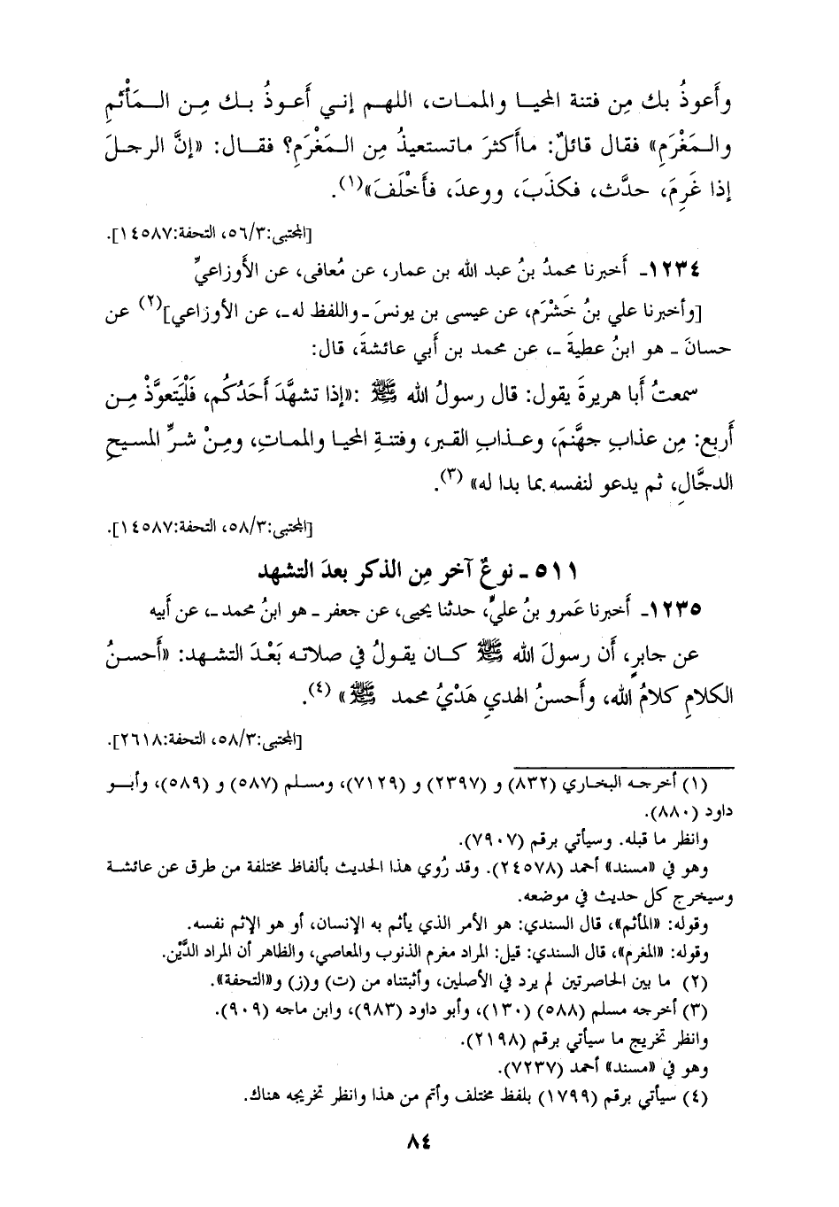 1234 - أَخْبَرَنَا مُحَمَّدُ بْنُ عَبْدِ اللهِ بْنِ عَمَّارٍ، عَنْ مُعَافَى، عَنِ الْأَوْزَاعِيِّ، وَأَخْبَرَنَا عَلِيُّ بْنُ خَشْرَمٍ، عَنْ عِيسَى بْنِ يُونُسَ وَاللَّفْظُ لَهُ، عَنِ الْأَوْزَاعِيِّ، عَنْ حَسَّانَ، هُوَ ابْنُ عَطِيَّةَ، عَنْ مُحَمَّدِ بْنِ أَبِي عَائِشَةَ، قَالَ: سَمِعْتُ أَبَا هُرَيْرَةَ، يَقُولُ: قَالَ رَسُولُ اللهِ صَلَّى اللهُ عَلَيْهِ وَسَلَّمَ: " §إِذَا تَشَهَّدَ أَحَدُكُمْ فَلْيَتَعَوَّذْ مِنْ أَرْبَعٍ: مِنْ عَذَابِ جَهَنَّمَ، وَعَذَابِ الْقَبْرِ، وَفِتْنَةِ الْمَحْيَا وَالْمَمَاتِ، وَمِنْ شَرِّ الْمَسِيحِ الدَّجَّالِ ثُمَّ يَدْعُو لِنَفْسِهِ بِمَا بَدَا لَهُ "