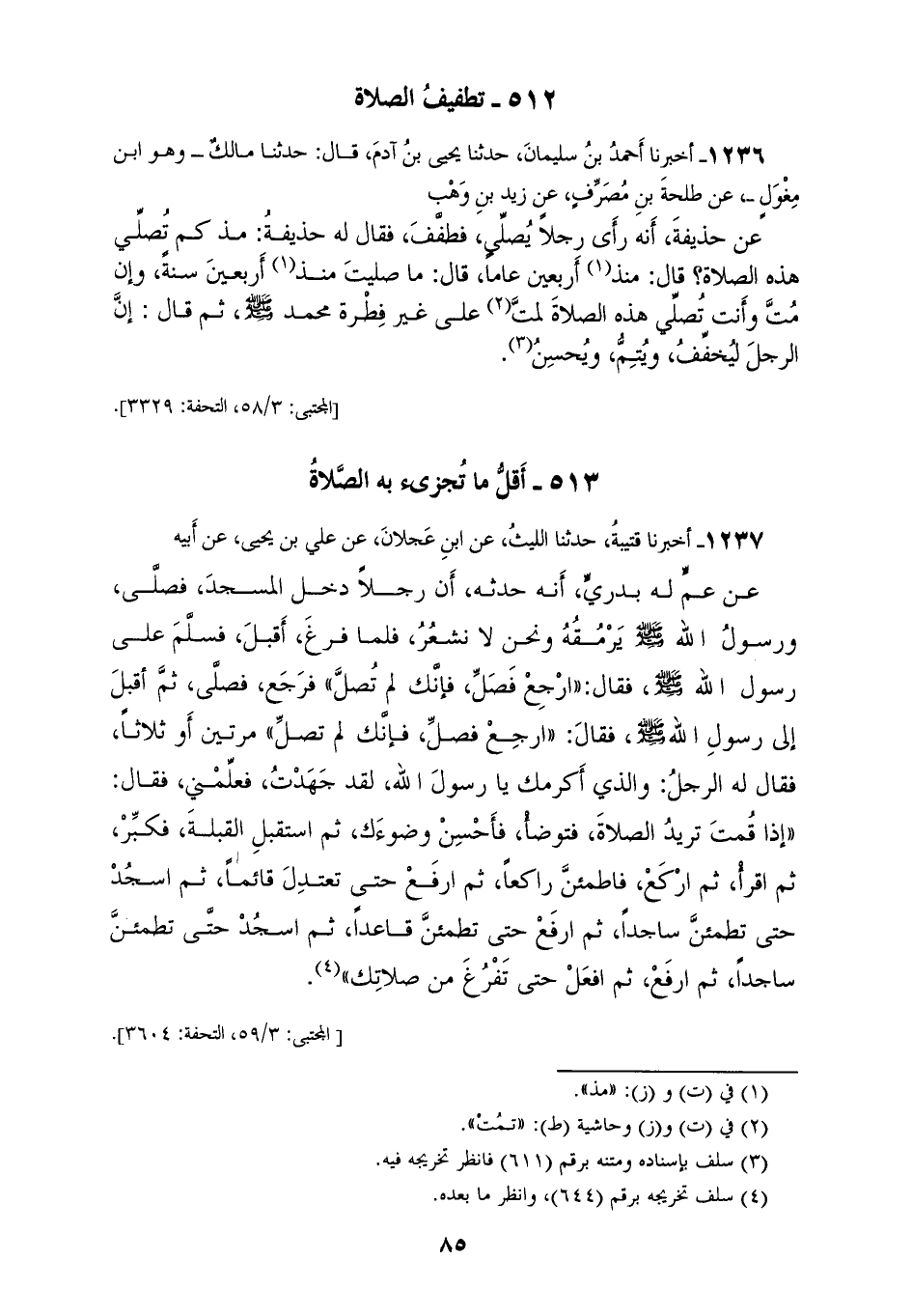 1236 - أَخْبَرَنَا أَحْمَدُ بْنُ سُلَيْمَانَ، حَدَّثَنَا يَحْيَى بْنُ آدَمَ، قَالَ: حَدَّثَنَا مَالِكٌ، وَهُوَ ابْنُ مِغْوَلٍ، عَنْ طَلْحَةَ بْنِ مُصَرِّفٍ، عَنْ زَيْدِ بْنِ وَهْبٍ، عَنْ حُذَيْفَةَ، أَنَّهُ رَأَى رَجُلًا يُصَلِّي فَطَفَّفَ، فَقَالَ لَهُ حُذَيْفَةُ: مُذْ كَمْ تُصَلِّي هَذِهِ الصَّلَاةَ؟ قَالَ: مُنْذُ أَرْبَعِينَ عَامًا، قَالَ: " §مَا صَلَّيْتَ مُنْذُ أَرْبَعِينَ سَنَةً، وَإِنْ مُتَّ وَأَنْتَ تُصَلِّي هَذِهِ الصَّلَاةَ لَمِتَّ عَلَى غَيْرِ فِطْرَةِ مُحَمَّدٍ صَلَّى اللهُ عَلَيْهِ وَسَلَّمَ، ثُمَّ قَالَ: إِنَّ الرَّجُلَ لَيُخَفِّفُ وَيُتِمُّ وَيُحْسِنُ "