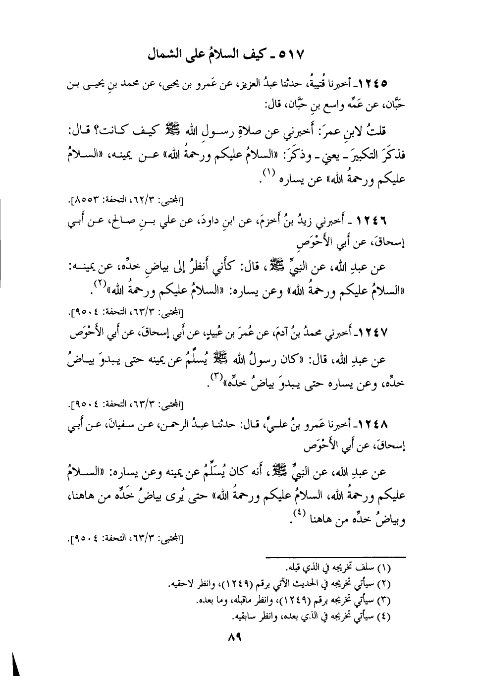 1246 - أَخْبَرَنِي زَيْدُ بْنُ أَخْزَمَ، عَنِ ابْنِ دَاوُدَ، عَنْ عَلِيِّ بْنِ صَالِحٍ، عَنْ أَبِي إِسْحَاقَ، عَنْ أَبِي الْأَحْوَصَ، عَنْ عَبْدِ اللهِ، عَنِ النَّبِيِّ صَلَّى اللهُ عَلَيْهِ وَسَلَّمَ قَالَ، كَأَنِّي أَنْظُرُ إِلَى بَيَاضِ خَدِّهِ، عَنْ يَمِينِهِ: «§السَّلَامُ عَلَيْكُمْ وَرَحْمَةُ اللهِ» وَعَنْ يَسَارِهِ: «السَّلَامُ عَلَيْكُمْ وَرَحْمَةُ اللهِ»