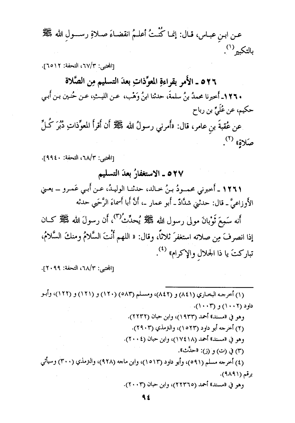 1261 - أَخْبَرَنِي مَحْمُودُ بْنُ خَالِدٍ، حَدَّثَنَا الْوَلِيدُ، عَنْ أَبِي عَمْرٍو يَعْنِي الْأَوْزَاعِيَّ، قَالَ: حَدَّثَنِي شَدَّادُ أَبُو عَمَّارٍ، أَنَّ أَبَا أَسْمَاءَ الرَّحَبِيَّ حَدَّثَهُ، أَنَّهُ سَمِعَ ثَوْبَانَ مَوْلَى رَسُولِ اللهِ صَلَّى اللهُ عَلَيْهِ وَسَلَّمَ يُحَدِّثُ، أَنَّ رَسُولَ اللهِ صَلَّى اللهُ عَلَيْهِ وَسَلَّمَ كَانَ إِذَا انْصَرَفَ مِنْ صَلَاتِهِ اسْتَغْفَرَ ثَلَاثًا، قَالَ: «§اللهُمَّ أَنْتَ السَّلَامُ، وَمِنْكَ السَّلَامُ، تَبَارَكْتَ يَا ذَا الْجِلَالِ وَالْإِكْرَامِ»