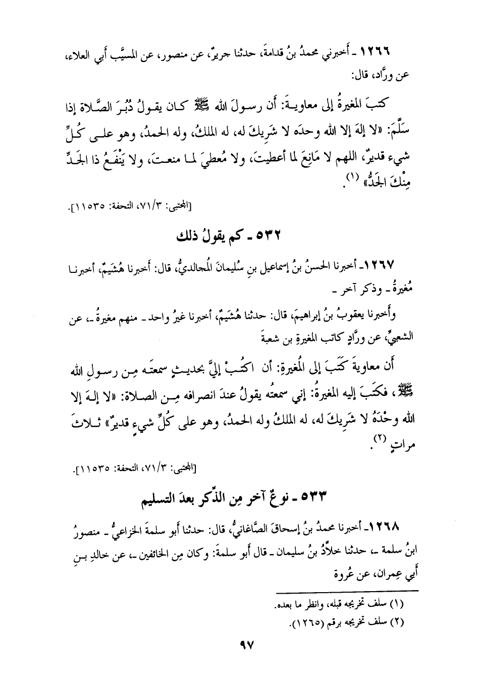 1267 - أَخْبَرَنَا الْحَسَنُ بْنُ إِسْمَاعِيلَ بْنَ سُلَيْمَانَ الْمُجَالِدِيُّ، قَالَ: أَخْبَرَنَا هُشَيْمٌ، أَخْبَرَنَا مُغِيرَةُ وَذَكَرَ آخَرَ. وَأَخْبَرَنَا يَعْقُوبُ بْنُ إِبْرَاهِيمَ، قَالَ: حَدَّثَنَا هُشَيْمٌ، أَخْبَرَنَا غَيْرُ وَاحِدٍ، مِنْهُمْ مُغِيرَةُ، عَنِ الشَّعْبِيِّ، عَنْ وَرَّادٍ كَاتِبِ الْمُغِيرَةِ بْنِ شُعْبَةَ، أَنَّ مُعَاوِيَةَ كَتَبَ إِلَى الْمُغِيرَةِ: أَنِ اكْتُبْ إِلَيَّ بِحَدِيثٍ سَمِعْتَهُ مِنْ رَسُولِ اللهِ صَلَّى اللهُ عَلَيْهِ وَسَلَّمَ، فَكَتَبَ إِلَيْهِ الْمُغِيرَةُ: إِنِّي سَمِعْتُهُ يَقُولُ عِنْدَ انْصِرَافِهِ مِنَ الصَّلَاةِ: «§لَا إِلَهَ إِلَّا اللهُ، وَحْدَهُ لَا شَرِيكَ لَهُ، لَهُ الْمُلْكُ، وَلَهُ الْحَمْدُ، وَهُوَ عَلَى كُلِّ شَيْءٍ قَدِيرٌ» ثَلَاثَ مَرَّاتٍ