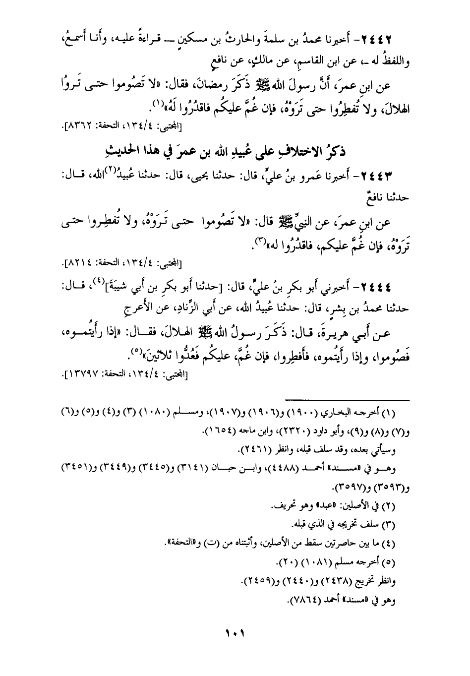 2443 - أَخْبَرَنَا عَمْرُو بْنُ عَلِيٍّ، قَالَ: حَدَّثَنَا يَحْيَى، قَالَ: حَدَّثَنَا عُبَيْدُ اللهِ، قَالَ: حَدَّثَنَا نَافِعٌ، عَنِ ابْنِ عُمَرَ، عَنِ النَّبِيِّ صَلَّى اللهُ عَلَيْهِ وَسَلَّمَ قَالَ: «§لَا تَصُومُوا حَتَّى تَرَوْهُ، وَلَا تُفْطِرُوا حَتَّى تَرَوْهُ، فَإِنْ غُمَّ عَلَيْكُمْ فَاقْدُرُوا لَهُ»