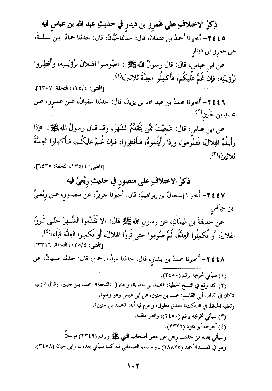 2446 - أَخْبَرَنَا مُحَمَّدُ بْنُ عَبْدِ اللهِ بْنِ يَزِيدَ، قَالَ: حَدَّثَنَا سُفْيَانُ، عَنْ عَمْرٍو، عَنْ مُحَمَّدِ بْنِ حُنَيْنٍ، عَنِ ابْنِ عَبَّاسٍ، قَالَ: عَجِبْتُ مِمَّنْ يَتَقَدَّمُ الشَّهْرَ وَقَدْ قَالَ رَسُولُ اللهِ صَلَّى اللهُ عَلَيْهِ وَسَلَّمَ: «§إِذَا رَأَيْتُمُ الْهِلَالَ فَصُومُوا، وَإِذَا رَأَيْتُمُوهُ فَأَفْطِرُوا، فَإِنْ غُمَّ عَلَيْكُمْ فَأَكْمِلُوا الْعِدَّةَ ثَلَاثِينَ»